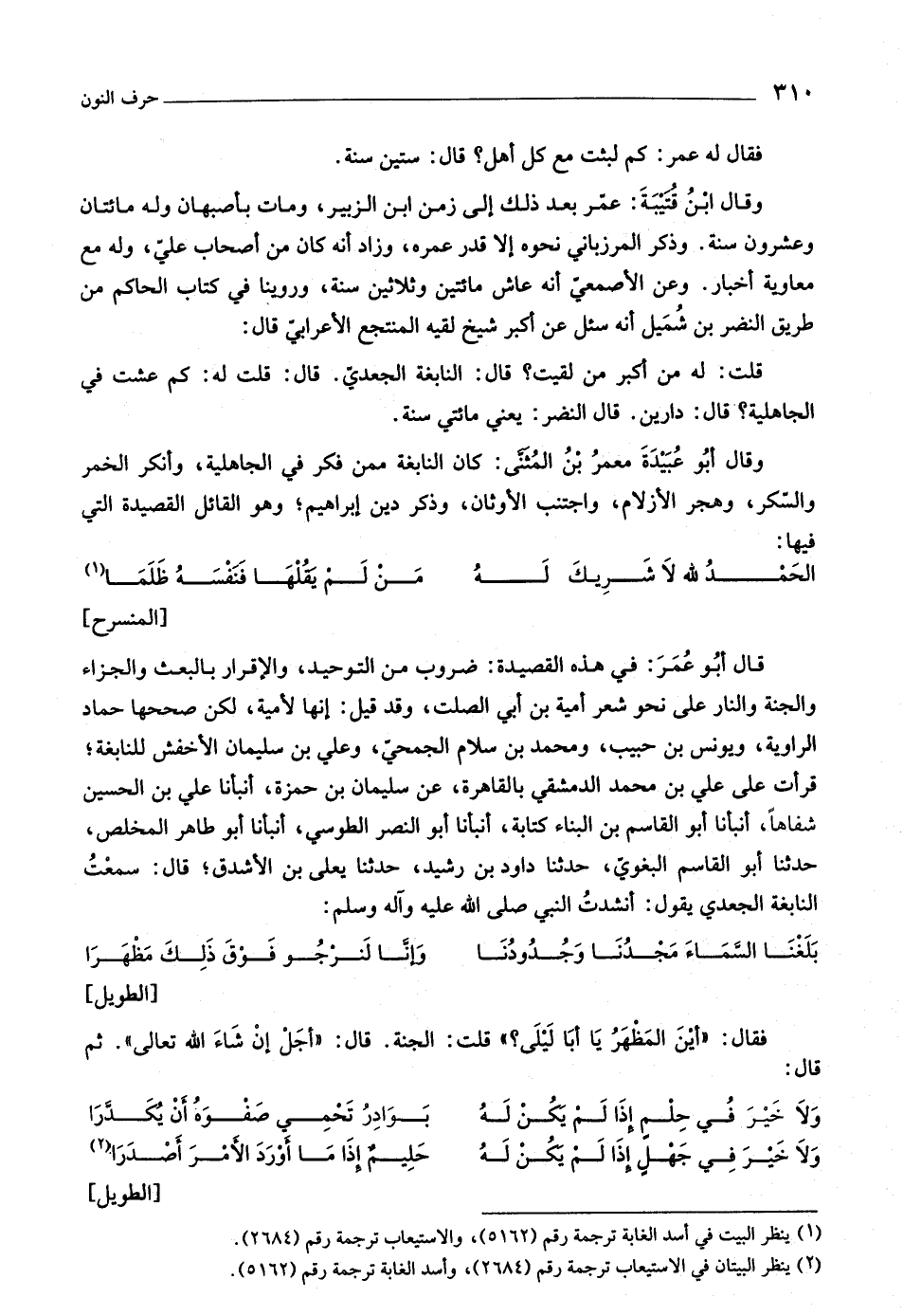 قلت: له من أكبر من لقيت؟ قال: النابغة الجعديّ. قال: قلت له: كم عشت في الجاهلية؟ قال: دارين. قال النضر: يعني مائتي سنة.