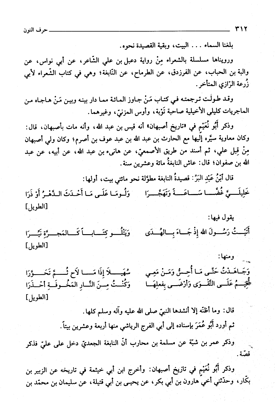 ورويناها مسلسلة بالشعراء من رواية دعبل بن علي الشّاعر، عن أبي نواس، عن والبة بن الحباب، عن الفرزدق، عن الطرماح، عن النّابغة، وهي في كتاب الشّعراء لأبي زرعة الرّازي المتأخر.