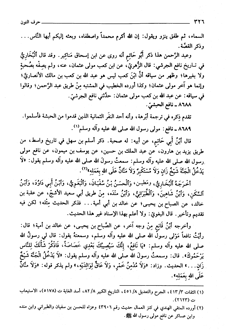 ذكر أسلم بن سهل في تاريخ واسط، من طريق يزيد بن هارون، عن عبد الملك بن حسين، عن يوسف بن ميمون، عن نافع مولى رسول اللَّه صلى اللَّه عليه وآله وسلم: سمعت رسول اللَّه صلى اللَّه عليه وآله وسلم يقول: «لا يدخل الجنّة شيخ زان ولا مستكبر ولا منّان على اللَّه بعمله» «٢» .