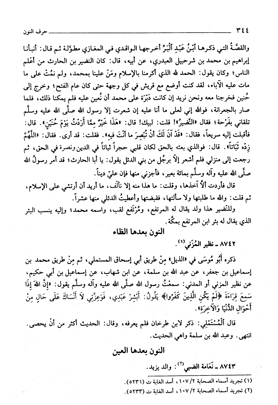 قال: أنبأنا إبراهيم بن محمد بن شرحبيل العبدري، عن أبيه، قال: كان النضير بن الحارث من أعلم الناس، وكان يقول: الحمد للَّه الّذي أكرمنا بالإسلام ومنّ علينا بمحمد، ولم نمت على ما مات عليه الآباء، لقد كنت أوضع مع قريش في كل وجهة حتى كان عام الفتح، وخرج إلى حنين فخرجنا معه ونحن نريد إن كانت دبرة على محمد أن نعين عليه فلم يمكنا ذلك، فلما صار بالجعرانة، فو اللَّه إني لعلى ما أنا عليه إن شعرت إلا رسول اللَّه صلّى اللَّه عليه وسلّم تلقاني بفرحة، فقال «النّضير» ! قلت: لبيك! قال: «هذا خير ممّا أردت يوم حنين» . قال: