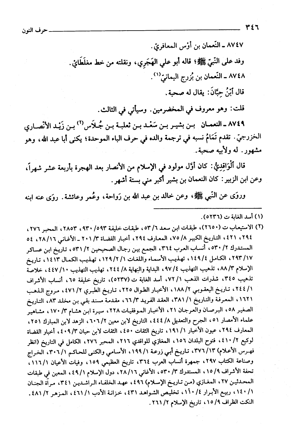 (٢) الاستيعاب ت (٢٦٥٠) ، طبقات ابن سعد ٦/ ٥٣، طبقات خليفة ٥٩٣/ ٩٣٠، ٢٨٥٣، المحبر ٢٧٦، ٢٩٤، ٤٢١، التاريخ الكبير ٨/ ٧٥، المعارف ٢٩٤، أخبار القضاة ٣/ ٢٠١- الأغاني ١٦/ ٢٨، ٥٤ المستدرك ٢/ ٥٣٠، أنساب العرب ٣٦٤، الجمع بين رجال الصحيحين ٢/ ٥٣١، تاريخ ابن عساكر ١٧/ ٢٩٣، الكامل ٤/ ١٤٩، تهذيب الأسماء واللغات ١/ ٢/ ١٢٩، تهذيب الكمال ١٤١٣، تاريخ الإسلام ٣/ ٨٨، تذهيب التهذيب ٤/ ٩٧، البداية والنهاية ٨/ ٢٤٤، تهذيب التهذيب ١٠/ ٤٤٧، خلاصة تذهيب ٣٤٥، شذرات الذهب ١/ ٧٢، أسد الغابة ت (٥٢٣٧) ، تاريخ خليفة ٦٥، أنساب الأشراف ١/ ٢٤٤، تاريخ اليعقوبي ٢/ ١٨٨، الأخبار الطوال ٢٢٥، تاريخ الطبري ٢/ ٤٧١، مروج الذهب ١٦٢١، المعرفة والتاريخ ١/ ٣٨١، العقد الفريد ٣/ ٦٦، مقدمة مسند بقي بن مخلد ٨٣، التاريخ الصغير ٥٨، البرصان والعرجان ٢١، والأخبار الموفقيات ٢٢٨، سيرة ابن هشام ٣/ ١٧٠، مشاهير علماء الأمصار ٥١، الجرح والتعديل ٨/ ٤٤٤، التاريخ لابن معين ٢/ ٦٠٦، الزهد لابن المبارك ٢٥١، المعارف ٢٩٤، عيون الأخبار ١/ ١٩١، تاريخ الثقات ٤٥٠، الثقات لابن حبان ٣/ ٤٠٩، أخبار القضاة لوكيع ٢/ ٤١٠، فتوح البلدان ١٥٦، المغازي للواقدي ٢١٦، المحبر ٢٧٦، الكامل في التاريخ (انظر فهرس الأعلام) ١٣/ ٣٧٦، تاريخ أبي زرعة ١/ ١٩٩، الأسامي والكنى للحاكم ١/ ٣٠٦، الخراج وصناعة الكتاب ٢٩٧، جمهرة أنساب العرب ٣٦٤، تاريخ العظيمي ١٥٩، وفيات الأعيان ١/ ١١٦، تحفة الأشراف ٩/ ١٥، المستدرك ٣/ ٥٣٠، الأغاني ١٦/ ٢٨، دول الإسلام ١/ ٤٩، المعين في طبقات المحدثين ٢٧، المغازي (من تاريخ الإسلام) ٤٩٦، عهد الخلفاء الراشدين ٣٤١، مرآة الجنان ١/ ١٤٠، ربيع الأبرار ٤/ ١١٠، تخليص الشواهد ٤٣١، خزانة الأدب ١/ ٤٦١، المزهر ٢/ ٤٨١. النكت الظراف ٩/ ١٥، تاريخ الإسلام ٢/ ٢٦١.