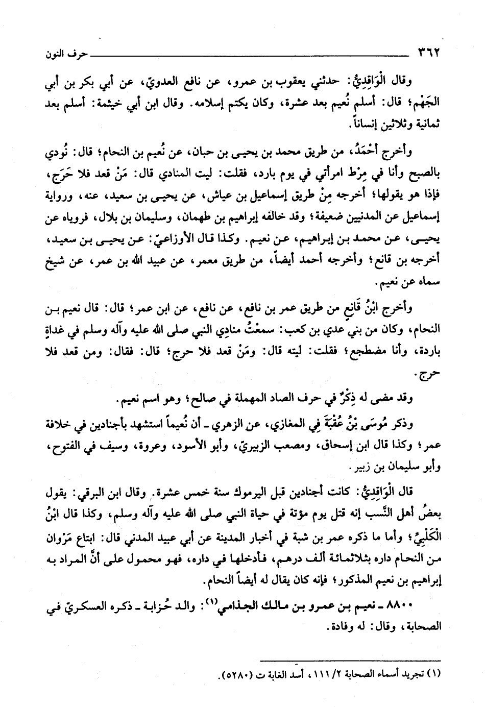 وأخرج ابن قانع من طريق عمر بن نافع، عن نافع، عن ابن عمر، قال: قال نعيم بن النحام، وكان من بني عدي بن كعب: سمعت منادي النبي صلّى اللَّه عليه وآله وسلّم في غداة باردة، وأنا مضطجع، فقلت: ليته قال: ومن قعد فلا حرج، قال: فقال: ومن قعد فلا حرج.