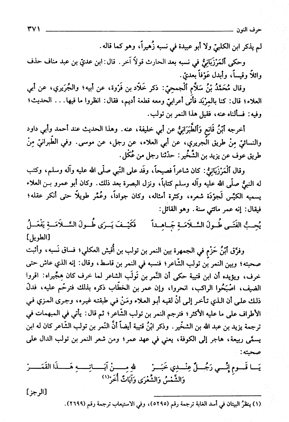 [الطويل] وفرّق ابن حزم في الجمهرة بين النمر بن تولب بن أقيش العكلي، فساق نسبه، وأثبت صحبته، وبين النمر بن تولد الشّاعر، فنسبه في النمر بن قاسط، وقال: إنه الّذي عاش حتى خوف، ويؤيده أن ابن قتيبة حكى أن النّمر بن تولب الشاعر لما خرف كان هجّيراه: أقروا الضيف، أصبحوا الراكب، انحروا، وإن عمر بن الخطّاب ذكره بذلك فترحّم عليه، فدلّ ذلك على أن الّذي تأخر إلى أن لقيه أبو العلاء ومن في طبقته غيره، وجرى المزي في الأطراف على ما عليه الأكثر، فترجم النمر بن تولب الشّاعر، ثم قال: يأتي في المبهمات في ترجمة يزيد بن عبد اللَّه بن الشخّير. وذكر ابن قتيبة أيضا أنّ النّمر بن تولب الشّاعر كان له ابن يسمّى ربيعة، هاجر إلى الكوفة، يعني في عهد عمر، ومن شعر النمر بن تولب الدال على صحبته: