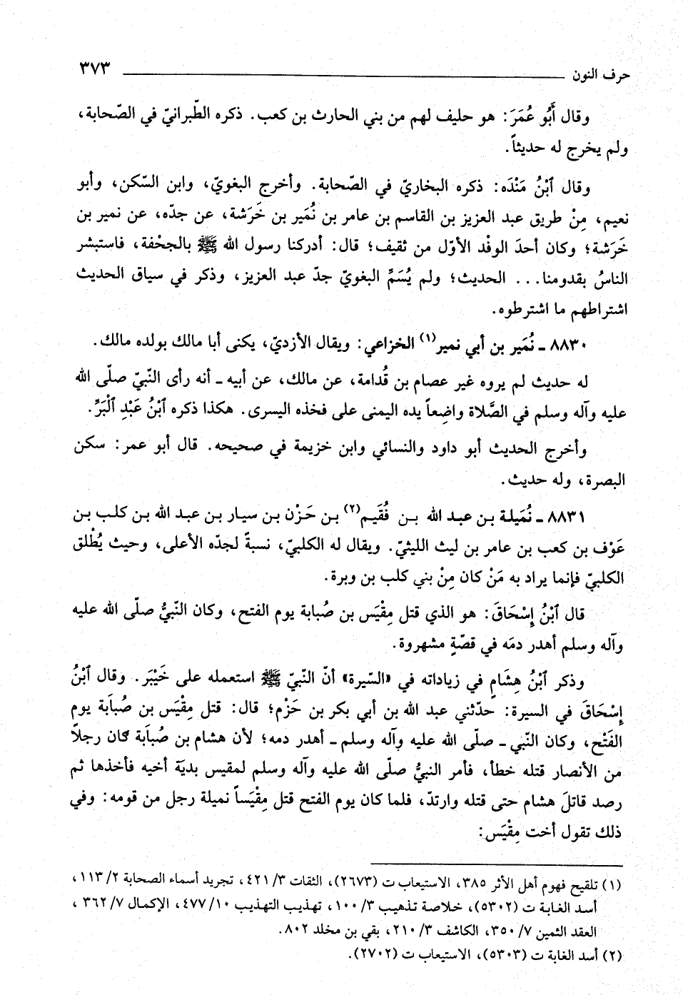 (١) تلقيح فهوم أهل الأثر ٣٨٥، الاستيعاب ت (٢٦٧٣) ، الثقات ٣/ ٤٢١، تجريد أسماء الصحابة ٢/ ١١٣، أسد الغابة ت (٥٣٠٢) ، خلاصة تذهيب ٣/ ١٠٠، تهذيب التهذيب ١٠/ ٤٧٧، الإكمال ٧/ ٣٦٢، العقد الثمين ٧/ ٣٥٠، الكاشف ٣/ ٢١٠، بقي بن مخلد ٨٠٢.