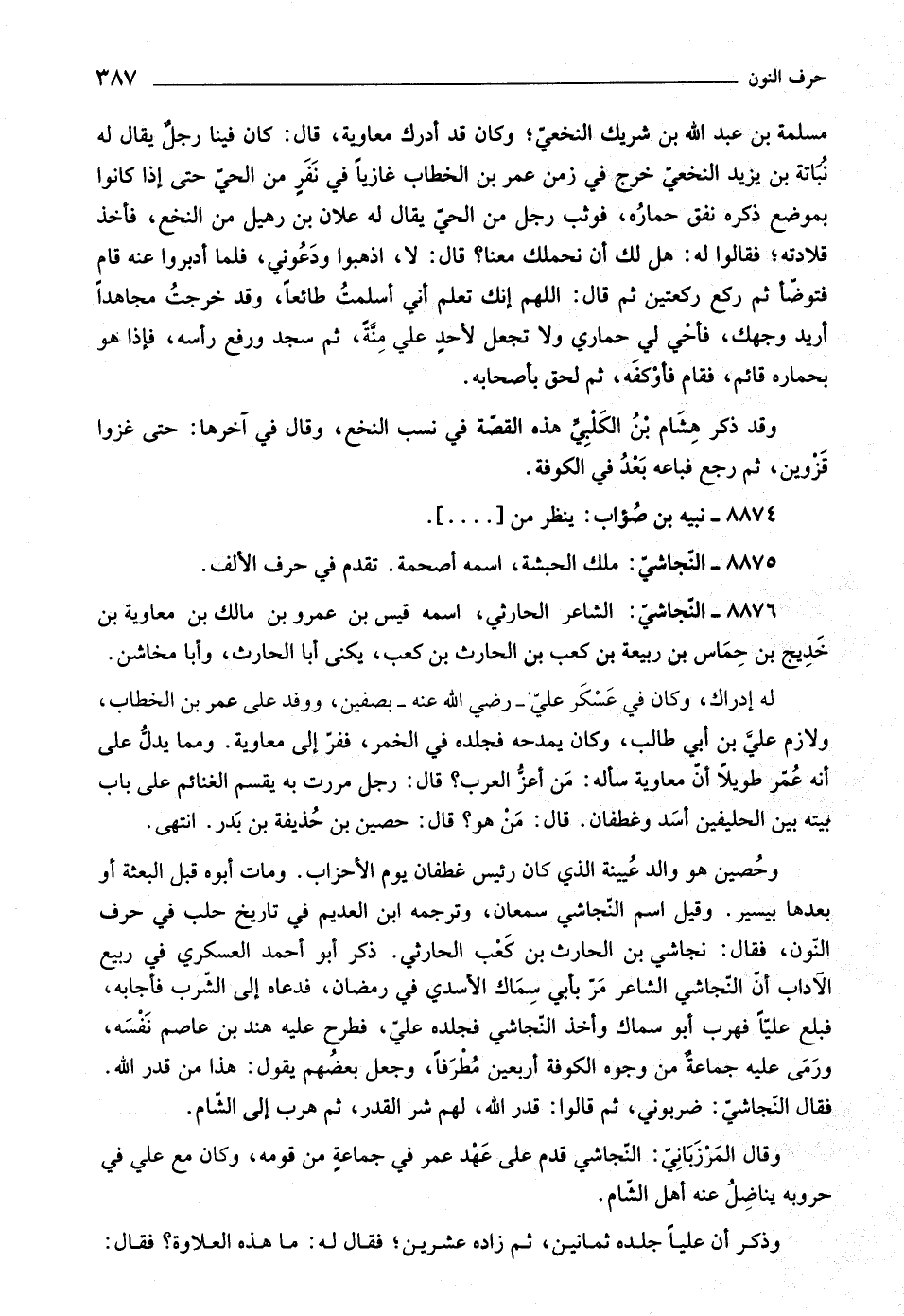 وقال المرزبانيّ: النّجاشي قدم على عهد عمر في جماعة من قومه، وكان مع علي في حروبه يناضل عنه أهل الشّام.