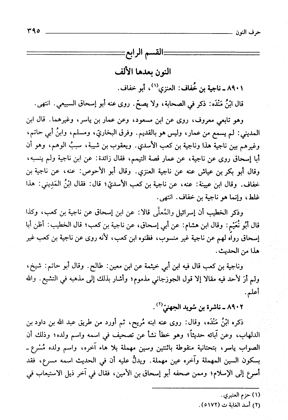 وهو تابعي معروف، روى عن ابن مسعود، وعن عمار بن ياسر، وغيرهما. قال ابن المديني: لم يسمع من عمار، وليس هو بالقديم. وفرق البخاريّ، ومسلم، وابن أبي حاتم، وغيرهم بين ناجية هذا وناجية بن كعب الأسدي. ويعقوب بن شيبة، سبب الوهم، وهو أن أبا إسحاق روى عن ناجية، عن عمار قصة التميم، فقال زائدة: عن ابن ناجية ولم ينسبه، وقال أبو بكر بن عياش عنه عن ناجية العنزي. وقال أبو الأحوص: عنه، عن ناجية بن خفاف. وقال ابن عيينة: عنه، عن ناجية بن كعب الأسديّ، قال: فقال ابن المديني: هذا غلط، وإنما هو ناجية بن خفاف. انتهى.