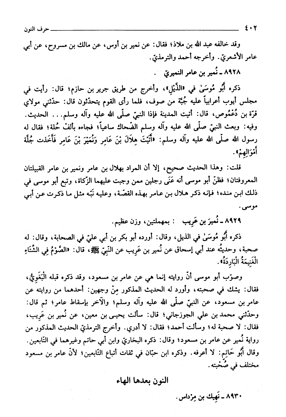 قلت: وهذا الحديث صحيح، إلا أن المراد بهلال بن عامر ونمير بن عامر القبيلتان المعروفتان، فظنّ أبو موسى أنه عنى رجلين ممن وجبت عليهما الزّكاة، وتبع أبو موسى في ذلك ابن مندة، فإنه ذكر هلال بن عامر بهذه القصّة، وعليه نبّه مثل ما ذكرت عن أبي موسى.