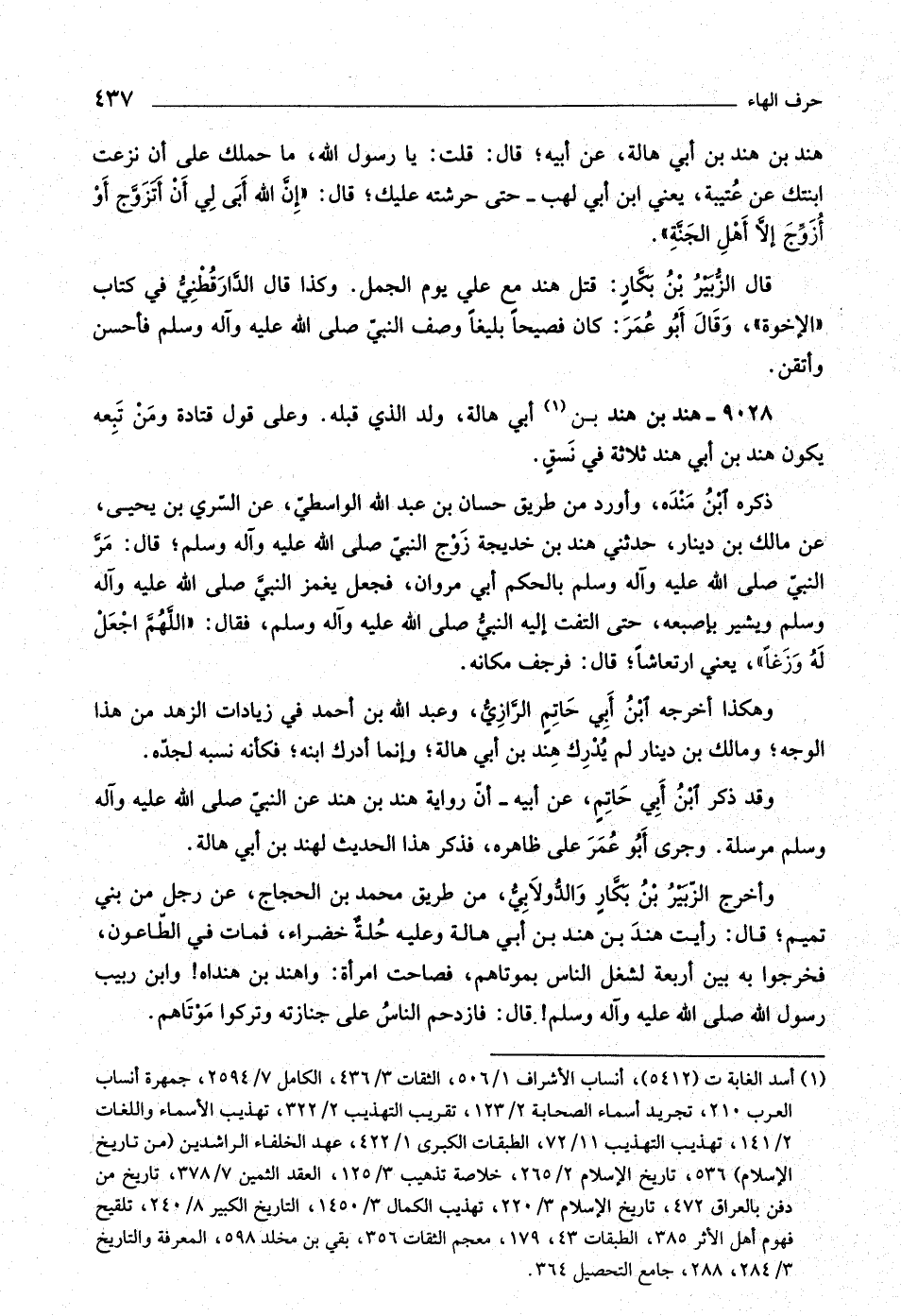قال الزّبير بن بكّار: قتل هند مع علي يوم الجمل. وكذا قال الدّار الدّارقطنيّ في كتاب «الإخوة» ، وقال أبو عمر: كان فصيحا بليغا وصف النبيّ صلّى اللَّه عليه وآله وسلّم فأحسن وأتقن.