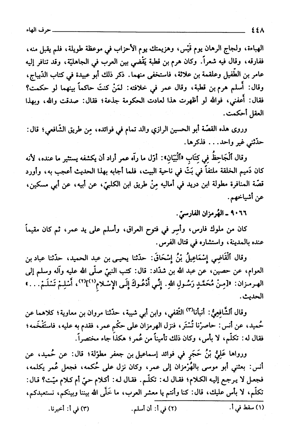 ورواها عليّ بن حجر في فوائد إسماعيل بن جعفر مطوّلة، قال: عن حميد، عن أنس: بعثني أبو موسى بالهرمزان إلى عمر، وكان نزل على حكمه، فجعل عمر يكلمه، فجعل لا يرجع إليه الكلام، فقال له: تكلّم. فقال له: أكلام حيّ أم كلام ميّت؟ قال: