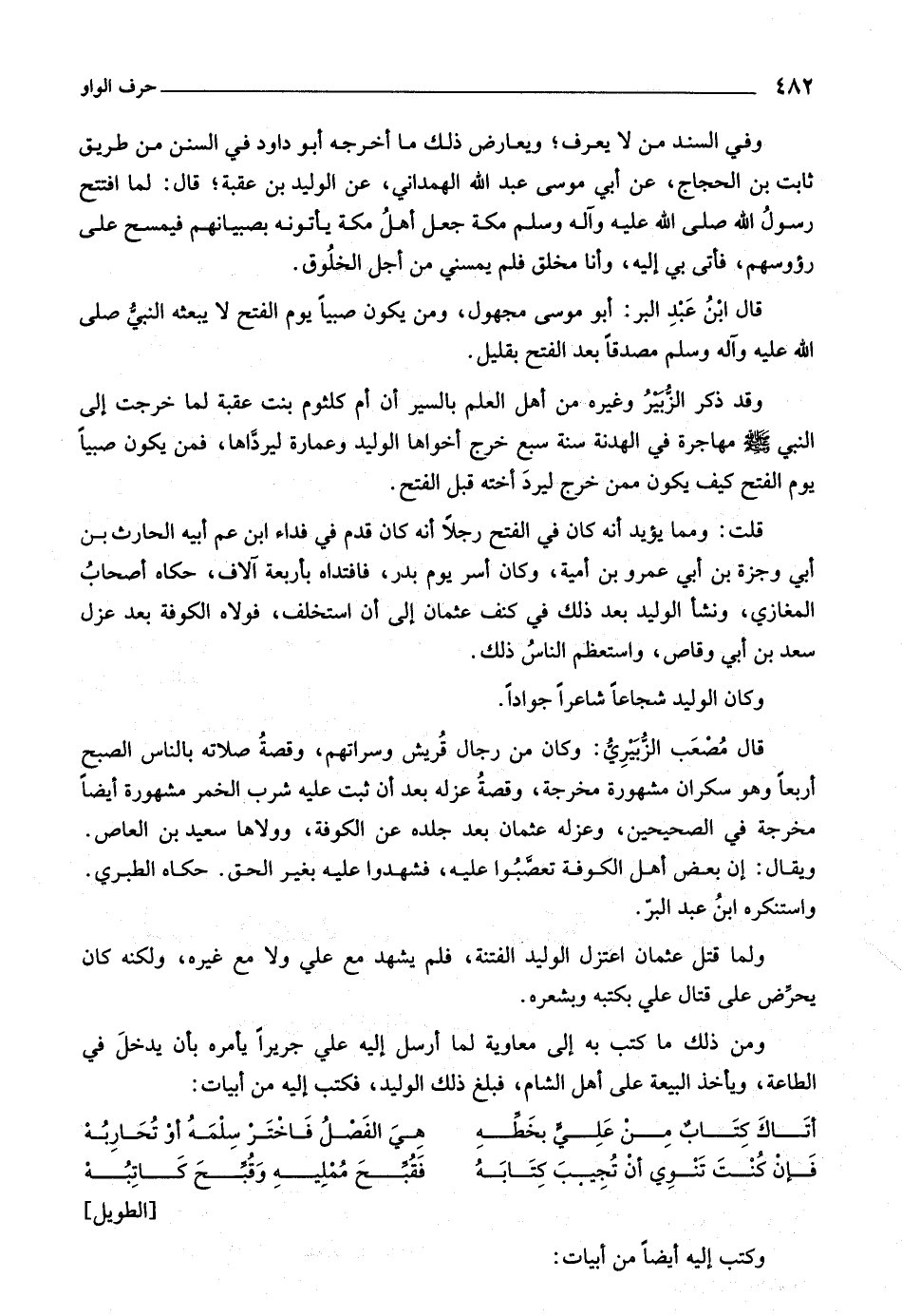 وقد ذكر الزّبير وغيره من أهل العلم بالسير أن أم كلثوم بنت عقبة لما خرجت إلى النبي صلى اللَّه عليه وسلّم مهاجرة في الهدنة سنة سبع خرج أخواها الوليد وعمارة ليردّاها، فمن يكون صبيا يوم الفتح كيف يكون ممن خرج ليرد أخته قبل الفتح.