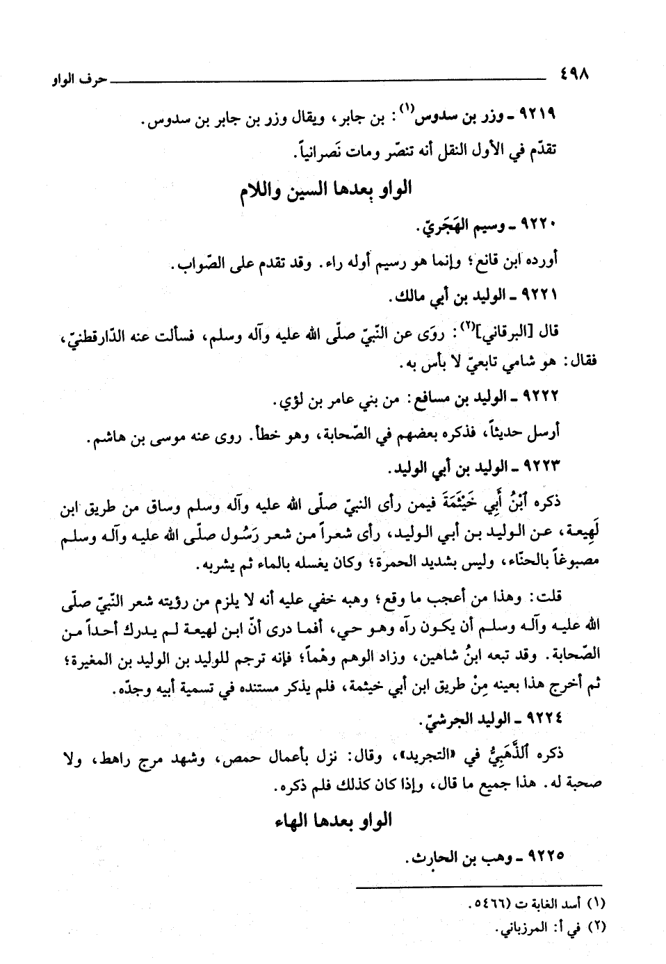 قلت: وهذا من أعجب ما وقع، وهبه خفي عليه أنه لا يلزم من رؤيته شعر النّبيّ صلى اللَّه عليه وآله وسلم أن يكون رآه وهو حي، أفما دري أنّ ابن لهيعة لم يدرك أحدا من الصّحابة. وقد تبعه ابن شاهين، وزاد الوهم وهما، فإنه ترجم للوليد بن الوليد بن المغيرة، ثم أخرج هذا بعينه من طريق ابن أبي خيثمة، فلم يذكر مستنده في تسمية أبيه وجدّه.