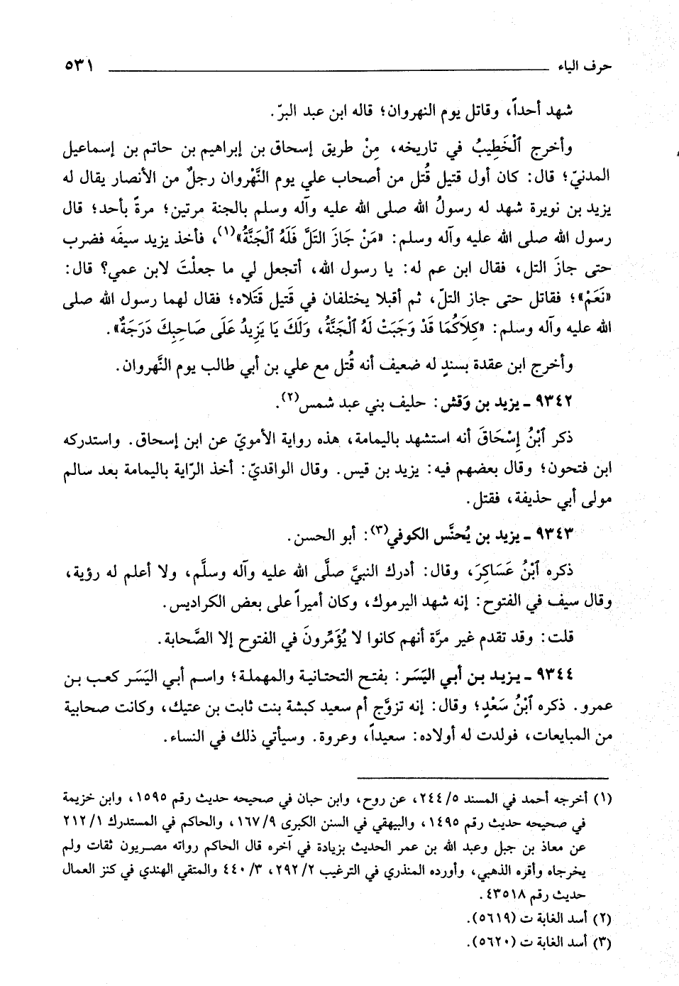 «نعم» ، فقاتل حتى جاز التلّ، ثم أقبلا يختلفان في قتيل قتلاه، فقال لهما رسول اللَّه صلّى اللَّه عليه وآله وسلم: «كلاكما قد وجبت له الجنّة، ولك يا يزيد على صاحبك درجة» .