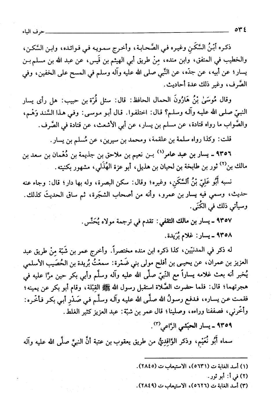 وقال موسى بن هارون الحمال الحافظ: قال: سئل قرّة بن حبيب: هل رأى يسار النبيّ صلّى اللَّه عليه وآله وسلّم؟ قال: اختلفوا. قال أبو موسى: وفي هذا السّند وهم، والصّواب ما رواه قتادة، عن مسلم بن يسار، عن أبي الأشعث، عن قتادة في الصّرف.