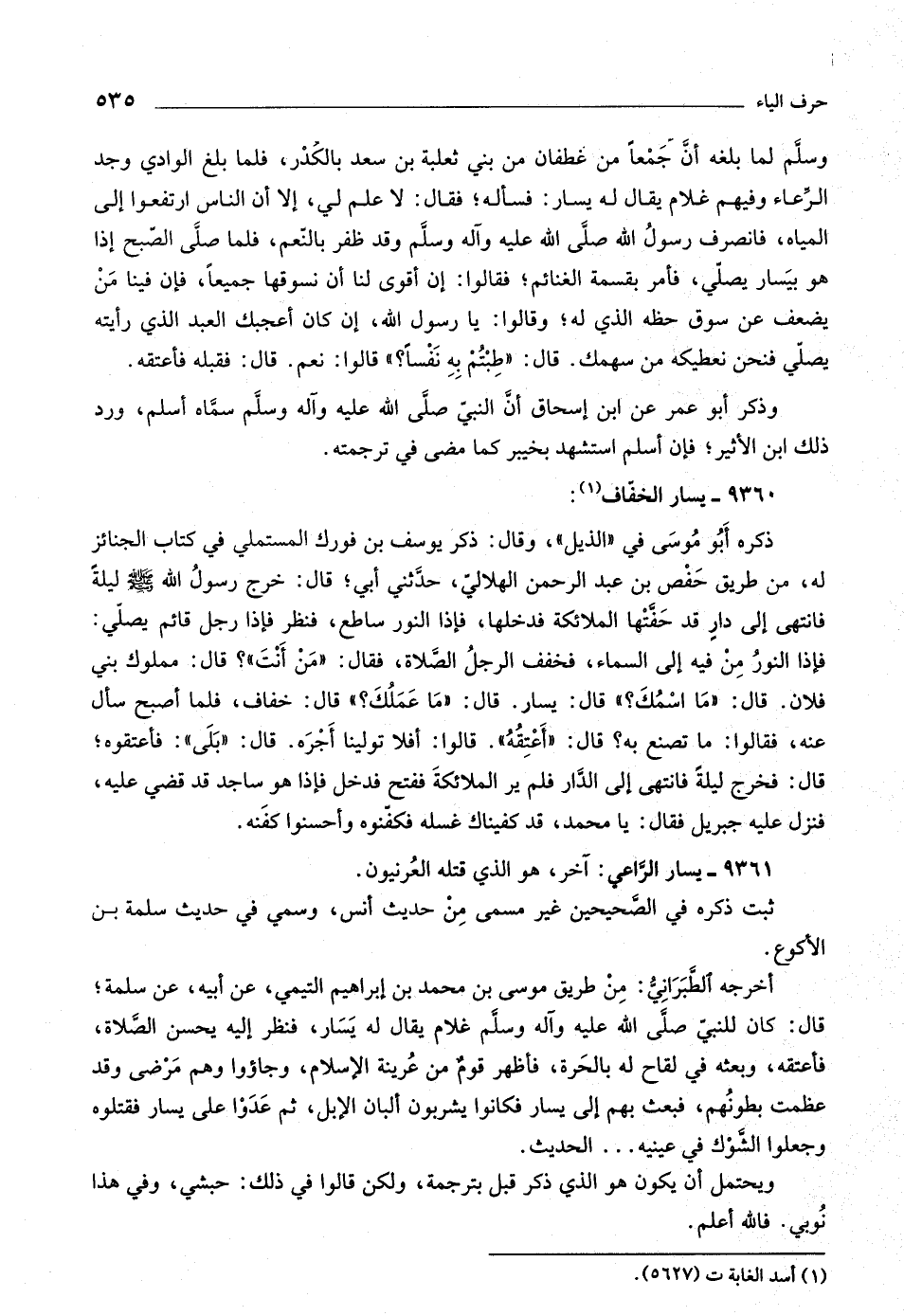 أخرجه الطّبرانيّ: من طريق موسى بن محمد بن إبراهيم التيمي، عن أبيه، عن سلمة، قال: كان للنبيّ صلّى اللَّه عليه وآله وسلّم غلام يقال له يسار، فنظر إليه يحسن الصّلاة، فأعتقه، وبعثه في لقاح له بالحرة، فأظهر قوم من عرينة الإسلام، وجاءوا وهم مرضى وقد عظمت بطونهم، فبعث بهم إلى يسار فكانوا يشربون ألبان الإبل، ثم عدوا على يسار فقتلوه وجعلوا الشّوك في عينيه ... الحديث.