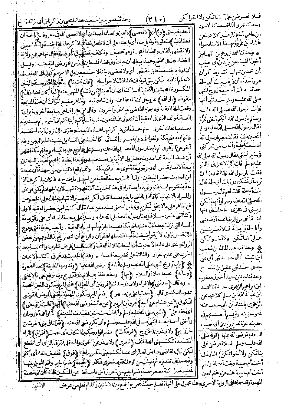 3894 - حَدَّثَنِي فَرْوَةُ بْنُ أَبِي الْمَغْرَاءِ حَدَّثَنَا عَلِيُّ بْنُ مُسْهِرٍ عَنْ هِشَامٍ عَنْ أَبِيهِ عَنْ عَائِشَةَ -رضي الله عنها- قَالَتْ: "تَزَوَّجَنِي النَّبِيُّ -صَلَّى اللَّهُ عَلَيْهِ وَسَلَّمَ- وَأَنَا بِنْتُ سِتِّ سِنِينَ، فَقَدِمْنَا الْمَدِينَةَ فَنَزَلْنَا فِي بَنِي الْحَارِثِ بْنِ الخَزْرَجٍ، فَوُعِكْتُ فَتَمَرَّقَ شَعَرِي، فَوَفَى جُمَيْمَةً، فَأَتَتْنِي أُمِّي أُمُّ رُومَانَ -وَإِنِّي لَفِي أُرْجُوحَةٍ وَمَعِي صَوَاحِبُ لِي- فَصَرَخَتْ بِي فَأَتَيْتُهَا، لاَ أَدْرِي مَا تُرِيدُ بِي، فَأَخَذَتْ بِيَدِي حَتَّى أَوْقَفَتْنِي عَلَى بَابِ الدَّارِ، وَإِنِّي لأَنْهَجُ حَتَّى سَكَنَ بَعْضُ نَفَسِي. ثُمَّ أَخَذَتْ شَيْئًا مِنْ مَاءٍ فَمَسَحَتْ بِهِ وَجْهِي وَرَأْسِي، ثُمَّ أَدْخَلَتْنِي الدَّارَ، فَإِذَا نِسْوَةٌ مِنَ الأَنْصَارِ فِي الْبَيْتِ، فَقُلْنَ: عَلَى الْخَيْرِ وَالْبَرَكَةِ، وَعَلَى خَيْرِ طَائِرٍ. فَأَسْلَمَتْنِي إِلَيْهِنَّ، فَأَصْلَحْنَ مِنْ شَأْنِي، فَلَمْ يَرُعْنِي إِلاَّ رَسُولُ اللَّهِ -صَلَّى اللَّهُ عَلَيْهِ وَسَلَّمَ- ضُحًى، فَأَسْلَمَتْنِي إِلَيْهِ، وَأَنَا يَوْمَئِذٍ بِنْتُ تِسْعِ سِنِينَ". [الحديث 3894 - أطرافه في: 3896، 5133، 5134، 5156، 5158، 5160].