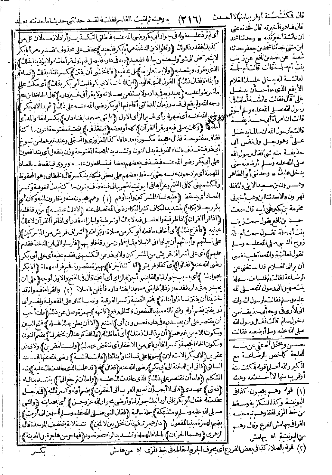 أي لم ترد عليه قوله في جوار أبي بكر -رضي الله عنه- فأطلق التكذيب وأراد لازمه لأن كل من كذبك فقد ردّ قولك (وقالوا لابن الدغنة: مر أبا بكر فليعبد) عطف على محذوف تقديره: مر أبا بكر لا يتعرض إلى شيء وليعبد من جاء له فليعبد (ربه في داره فليصل فيها وليقرأ ما شاء ولا يؤذينا بذلك) الذي يقرأه ويتعبد به (ولا يستعلن به) بل يخفيه (فإنا نخشى أن يفتن) بكسر التاء بذلك (نساءنا وأبناءنا فقال ذلك) القول الذي قالوه (ابن الدغنة لأبي بكر فلبث أبو بكر بذلك) أي مكث على ما شرطوا عليه (يعبد ربه في داره ولا يستعلن بصلاته ولا يقرأ في غير داره). قال الحافظ ابن حجر رحمه الله: ولم يقع لي قدر زمان المدة التي أقام فيها أبو بكر -رضي الله عنه- على ذلك (ثم بدا لأبي بكر) -رضي الله عنه- أي ظهر له رأي غير الرأي الأول (فابتنى مسجدًا بفناء داره) بكسر الفاء والمد أي أمامها (وكان يصل فيه ويقرأ القرآن) كله أو بعضه (فيتقذف) بتحتية مفتوحة فنون ساكنة فقاف مفتوحة فذال معجمة مكسورة بعدها فاء كذا للمروزي والمستملي وعند غيرهما من شيوخ أبي ذر فيتقذف بالتاء الفوقية بدل النون وتشديد المعجمة المفتوحة بوزن يتفعل أي يتدافعون على أبي بكر -رضي الله عنه- فيقذف بعضهم بعضًا فيتساقطون عليه، ويروى فيتقصف بالصاد المهملة أي يزدحمون عليه حتى يسقط بعضهم على بعض فيكاد ينكسر. قال الخطابي: وهو المحفوظ، وللكشميهني كما في الفتح وعزاها في اليونينية للجرجاني فيتقصف بنون ساكنة بدل الفوقية وكسر الصاد أي يسقط (عليه نساء المشركين وأبناؤهم وهم يعجبون منه وينظرون إليه وكان أبو بكر رجلاً بكاء) بتشديد الكاف كثير البكاء - رضي الله تعالى عنه - (لا يملك عينيه) من رقة قلبه (إذا قرأ القرآن) إذا ظرفية والعامل فيه لا يملك أو شرطية والجزاء مقدر أي إذا قرأ القرآن لا يملك عينيه (فأفزع ذلك) أي أخاف ما فعله أبو بكر من صلاته وقراءته (أشراف قريش من المشركين) على نسائهم وأبنائهم أن يميلوا إلى الإسلام لما يعلمون من رقة قلوبهم (فأرسلوا إلى ابن الدغنة فقدم عليهم) أي على أشراف قريش من المشركين، ولأبي ذر عن الكشميهني: فقدم عليه أي على أبي بكر -رضي الله عنه- (فقالوا): أي كفار قريش (إنا كنا أجرنا) بهمزة مقصورة فجيم فراء مهملة (أبا بكر بجوارك) أي بسبب جوارك، وللقابسي أجزنا بالزاي أي أبحنا. قال في الفتح: والأول أوجه (على أن يعبد ربه في داره فقد جاوز ذلك فابتنى مسجدًا بفناء داره فأعلن بالصلاة والقراءة