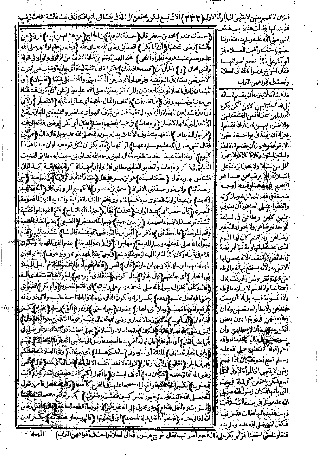 3932 - حَدَّثَنَا مُسَدَّدٌ حَدَّثَنَا عَبْدُ الْوَارِثِ ح. وَحَدَّثَنَا إِسْحَاقُ بْنُ مَنْصُورٍ أَخْبَرَنَا عَبْدُ الصَّمَدِ قَالَ: سَمِعْتُ أَبِي يُحَدِّثُ حَدَّثَنَا أَبُو التَّيَّاحِ يَزِيدُ بْنُ حُمَيْدٍ الضُّبَعِيُّ قَالَ: حَدَّثَنِي أَنَسُ بْنُ مَالِكٍ -رضي الله عنه- قَالَ: "لَمَّا قَدِمَ رَسُولُ اللَّهِ -صَلَّى اللَّهُ عَلَيْهِ وَسَلَّمَ- الْمَدِينَةَ نَزَلَ فِي عُلْوِ الْمَدِينَةِ، فِي حَىٍّ يُقَالُ لَهُمْ بَنُو عَمْرِو بْنِ عَوْفٍ، قَالَ: فَأَقَامَ فِيهِمْ أَرْبَعَ عَشْرَةَ لَيْلَةً، ثُمَّ أَرْسَلَ إِلَى مَلإِ بَنِي النَّجَّارِ، قَالَ: فَجَاءُوا مُتَقَلِّدِي سُيُوفِهِمْ. قَالَ: وَكَأَنِّي أَنْظُرُ إِلَى رَسُولِ اللَّهِ -صَلَّى اللَّهُ عَلَيْهِ وَسَلَّمَ- عَلَى رَاحِلَتِهِ وَأَبُو بَكْرٍ رِدْفَهُ وَمَلأُ بَنِي النَّجَّارِ حَوْلَهُ حَتَّى أَلْقَى بِفِنَاءِ أَبِي أَيُّوبَ، قَالَ: فَكَانَ يُصَلِّي حَيْثُ أَدْرَكَتْهُ الصَّلاَةُ وَيُصَلِّي فِي مَرَابِضِ الْغَنَمِ. قَالَ: ثُمَّ إِنَّهُ أَمَرَ بِبِنَاءِ الْمَسْجِدِ، فَأَرْسَلَ إِلَى مَلإِ بَنِي النَّجَّارِ، فَجَاءُوا. فَقَالَ: يَا بَنِي النَّجَّارِ ثَامِنُونِي حَائِطَكُمْ هَذَا، فَقَالُوا: لاَ وَاللَّهِ لاَ نَطْلُبُ ثَمَنَهُ إِلاَّ إِلَى اللَّهِ. قَالَ: فَكَانَ فِيهِ مَا أَقُولُ لَكُمْ: كَانَتْ فِيهِ قُبُورُ الْمُشْرِكِينَ، وَكَانَتْ فِيهِ خِرَبٌ، وَكَانَ فِيهِ نَخْلٌ. فَأَمَرَ رَسُولُ اللَّهِ -صَلَّى اللَّهُ عَلَيْهِ وَسَلَّمَ- بِقُبُورِ الْمُشْرِكِينَ فَنُبِشَتْ، وَبِالْخِرَبِ فَسُوِّيَتْ، وَبِالنَّخْلِ فَقُطِعَ، قَالَ فَصَفُّوا النَّخْلَ قِبْلَةَ الْمَسْجِدِ، قَالَ وَجَعَلُوا عِضَادَتَيْهِ حِجَارَةً. قَالَ: جَعَلُوا يَنْقُلُونَ ذَاكَ الصَّخْرَ وَهُمْ يَرْتَجِزُونَ وَرَسُولُ اللَّهِ -صَلَّى اللَّهُ عَلَيْهِ وَسَلَّمَ- مَعَهُمْ يَقُولُونَ: