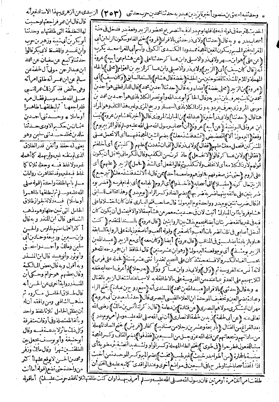وبه قال: (حدّثنا أحمد بن محمد) قال الدارقطني: هو أحمد بن محمد بن ثابت يعرف بابن شبويه وقال الحاكم أبو عبد الله وأبو نصر الكلاباذي: هو أحمد بن محمد بن موسى المروزي يعرف بمردويه وزاد الكلاباذي السمسار، ورجح المزي وغيره هذا الثاني وهو المراد هنا قال: (حدّثنا) ولأبي ذر: أخبرنا (عبد الله) بن المبارك المروزي قال: (أخبرنا هشام بن عروة) ثبت ابن عروة في اليونينية (عن أبيه) عروة (أن أصحاب رسول الله -صَلَّى اللَّهُ عَلَيْهِ وَسَلَّمَ- قالوا للزبير يوم) وقعة (اليرموك: ألا) للتخصيص (تشد فنشدّ معك) بضم الشين المعجمة فيهما أي ألا تحمل على المشركين فنحمل معك عليهم (فقال): ولأبي ذر: وقال (إني إن شددت) عليهم (كذبتم) أي أخلفتم (فقالوا): ولابن عساكر قالوا (لا نفعل) ما ذكرت من الكذب. وقال الكرماني: يحتمل أن يكون قولهم لا ردًا لكلامه أي لا نخلف ولا نكذب ثم قالوا: نفعل أي الشد (فحمل) الزبير (عليهم) أي على الروم (حتى شق صفوفهم فجاوزهم وما معه أحد) ممن قال له ألا تشد فنشد معك (ثم رجع) الزبير حال كونه (مقبلاً) إلى أصحابه (فأخذوا) أي الروم (بلجامه) أي بلجام فرسه (فضربوه ضربتين على عاتقه بينهما ضربة ضربها) بضم الضاد وكسر الراء (يوم بدر) وهذا مخالف للسابق إذ قال: ضرب اثنتين يوم بدر وواحدة يوم اليرموك. قال صاحب فتح الباري: فإن كان اختلافًا على هشام فرواية ابن المبارك أثبت لأن في حديث معمر عن هشام مقالا وإلا فيحتمل أن يكون كان فيه في غير عاتقه ضربتان أيضًا فيجمع بذلك بين الروايتين.