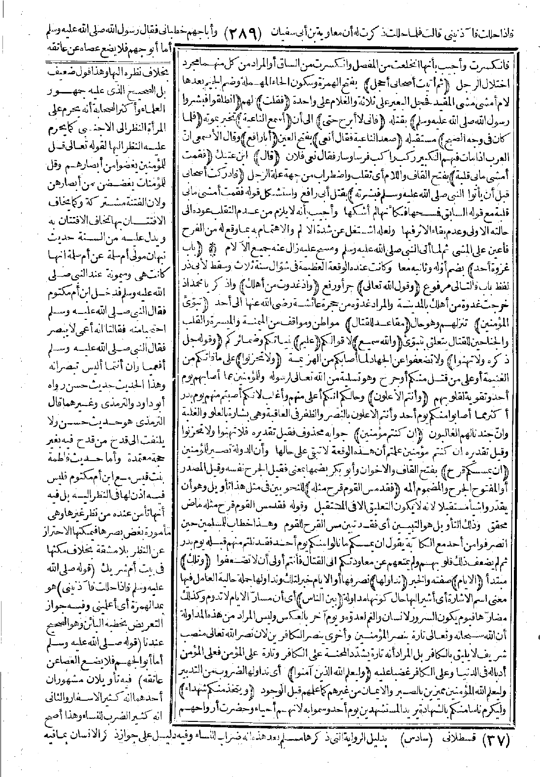 وَقَوْلِ اللَّهِ تَعَالَى: {وَإِذْ غَدَوْتَ مِنْ أَهْلِكَ تُبَوِّئُ الْمُؤْمِنِينَ مَقَاعِدَ لِلْقِتَالِ وَاللَّهُ سَمِيعٌ عَلِيمٌ} [آل عمران: 121] وَقَوْلُهُ جَلَّ ذِكْرُهُ: {وَلاَ تَهِنُوا وَلاَ تَحْزَنُوا وَأَنْتُمُ الأَعْلَوْنَ إِنْ كُنْتُمْ مُؤْمِنِينَ * إِنْ يَمْسَسْكُمْ قَرْحٌ فَقَدْ مَسَّ الْقَوْمَ قَرْحٌ مِثْلُهُ وَتِلْكَ الأَيَّامُ نُدَاوِلُهَا بَيْنَ النَّاسِ وَلِيَعْلَمَ اللَّهُ الَّذِينَ آمَنُوا وَيَتَّخِذَ مِنْكُمْ شُهَدَاءَ وَاللَّهُ لاَ يُحِبُّ الظَّالِمِينَ * وَلِيُمَحِّصَ اللَّهُ الَّذِينَ آمَنُوا وَيَمْحَقَ الْكَافِرِينَ * أَمْ حَسِبْتُمْ أَنْ تَدْخُلُوا الْجَنَّةَ وَلَمَّا يَعْلَمِ اللَّهُ الَّذِينَ جَاهَدُوا مِنْكُمْ وَيَعْلَمَ الصَّابِرِينَ * وَلَقَدْ كُنْتُمْ تَمَنَّوْنَ الْمَوْتَ مِنْ قَبْلِ أَنْ تَلْقَوْهُ فَقَدْ رَأَيْتُمُوهُ وَأَنْتُمْ تَنْظُرُونَ} [آل عمران: 139 - 143] وَقَوْلِهِ {وَلَقَدْ صَدَقَكُمُ اللَّهُ وَعْدَهُ إِذْ تَحُسُّونَهُمْ} [آل عمران: 152] تَسْتَأْصِلُونَهُمْ قَتْلاَ {بِإِذْنِهِ حَتَّى إِذَا فَشِلْتُمْ وَتَنَازَعْتُمْ فِي الأَمْرِ وَعَصَيْتُمْ مِنْ بَعْدِ مَا أَرَاكُمْ مَا تُحِبُّونَ مِنْكُمْ مَنْ يُرِيدُ الدُّنْيَا وَمِنْكُمْ مَنْ يُرِيدُ الآخِرَةَ ثُمَّ صَرَفَكُمْ عَنْهُمْ لِيَبْتَلِيَكُمْ وَلَقَدْ عَفَا عَنْكُمْ وَاللَّهُ ذُو فَضْلٍ عَلَى الْمُؤْمِنِينَ} [آل عمران: 152] وقَوْلِهِ تَعَالَى: {وَلاَ تَحْسِبَنَّ الَّذِينَ قُتِلُوا فِي سَبِيلِ اللَّهِ أَمْوَاتًا} [آل عمران: 169] الآيَةَ.