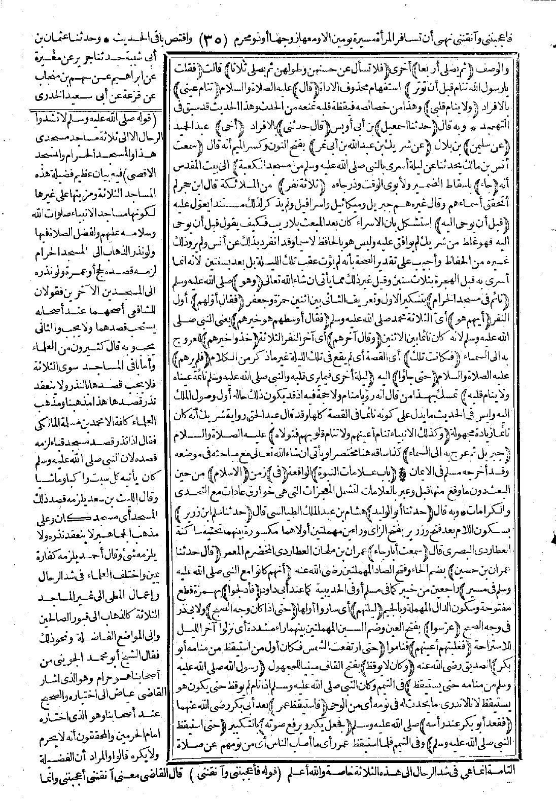 3571 - حَدَّثَنَا أَبُو الْوَلِيدِ حَدَّثَنَا سَلْمُ بْنُ زَرِيرٍ سَمِعْتُ أَبَا رَجَاءٍ قَالَ: «حَدَّثَنَا عِمْرَانُ بْنُ حُصَيْنٍ أَنَّهُمْ كَانُوا مَعَ النَّبِيِّ -صَلَّى اللَّهُ عَلَيْهِ وَسَلَّمَ- فِي مَسِيرٍ فَأَدْلَجُوا لَيْلَتَهُمْ، حَتَّى إِذَا كَانَ وَجْهُ الصُّبْحِ عَرَّسُوا، فَغَلَبَتْهُمْ أَعْيُنُهُمْ حَتَّى ارْتَفَعَتِ الشَّمْسُ، فَكَانَ أَوَّلَ مَنِ اسْتَيْقَظَ مِنْ مَنَامِهِ أَبُو بَكْرٍ -وَكَانَ لاَ يُوقَظُ رَسُولُ اللَّهِ -صَلَّى اللَّهُ عَلَيْهِ وَسَلَّمَ- مِنْ مَنَامِهِ حَتَّى يَسْتَيْقِظَ- فَاسْتَيْقَظَ عُمَرُ، فَقَعَدَ أَبُو بَكْرٍ عِنْدَ رَأْسِهِ فَجَعَلَ يُكَبِّرُ وَيَرْفَعُ صَوْتَهُ حَتَّى اسْتَيْقَظَ النَّبِيُّ -صَلَّى اللَّهُ عَلَيْهِ وَسَلَّمَ- فَنَزَلَ وَصَلَّى بِنَا الْغَدَاةَ، فَاعْتَزَلَ رَجُلٌ مِنَ الْقَوْمِ لَمْ يُصَلِّ مَعَنَا، فَلَمَّا انْصَرَفَ قَالَ: يَا فُلاَنُ مَا يَمْنَعُكَ أَنْ تُصَلِّيَ مَعَنَا؟ قَالَ: أَصَابَتْنِي جَنَابَةٌ، فَأَمَرَهُ أَنْ يَتَيَمَّمَ بِالصَّعِيدِ ثُمَّ صَلَّى، وَجَعَلَنِي رَسُولُ اللَّهِ -صَلَّى اللَّهُ عَلَيْهِ وَسَلَّمَ- فِي رَكُوبٍ بَيْنَ يَدَيْهِ وَقَدْ عَطِشْنَا عَطَشًا شَدِيدًا، فَبَيْنَمَا نَحْنُ نَسِيرُ إِذَا نَحْنُ بِامْرَأَةٍ سَادِلَةٍ رِجْلَيْهَا بَيْنَ مَزَادَتَيْنِ، فَقُلْنَا لَهَا: أَيْنَ الْمَاءُ؟ فَقَالَتْ: إِنَّهُ لاَ مَاءَ. فَقُلْنَا: كَمْ بَيْنَ أَهْلِكِ وَبَيْنَ الْمَاءِ؟ قَالَتْ: يَوْمٌ وَلَيْلَةٌ. فَقُلْنَا: انْطَلِقِي إِلَى رَسُولِ اللَّهِ -صَلَّى اللَّهُ عَلَيْهِ وَسَلَّمَ-. قَالَتْ: وَمَا رَسُولُ اللَّهِ؟ فَلَمْ نُمَلِّكْهَا مِنْ أَمْرِهَا حَتَّى اسْتَقْبَلْنَا بِهَا النَّبِيَّ -صَلَّى اللَّهُ عَلَيْهِ وَسَلَّمَ-، فَحَدَّثَتْهُ بِمِثْلِ الَّذِي حَدَّثَتْنَا، غَيْرَ أَنَّهَا حَدَّثَتْهُ أَنَّهَا مُؤْتِمَةٌ، فَأَمَرَ بِمَزَادَتَيْهَا فَمَسَحَ فِي الْعَزْلاَوَيْنِ، فَشَرِبْنَا عِطَاشًا أَرْبَعِينَ رَجُلاً حَتَّى رَوِينَا، فَمَلأْنَا كُلَّ قِرْبَةٍ مَعَنَا وَإِدَاوَةٍ غَيْرَ أَنَّهُ لَمْ نَسْقِ بَعِيرًا، وَهْيَ تَكَادُ تَنِضُّ مِنَ الْمِلْءِ. ثُمَّ قَالَ: هَاتُوا مَا عِنْدَكُمْ، فَجُمِعَ لَهَا مِنَ الْكِسَرِ وَالتَّمْرِ حَتَّى أَتَتْ أَهْلَهَا قَالَتْ: لَقِيتُ أَسْحَرَ النَّاسِ، أَوْ هُوَ نَبِيٌّ كَمَا زَعَمُوا. فَهَدَى اللَّهُ ذَاكَ الصِّرْمَ بِتِلْكَ الْمَرْأَةِ، فَأَسْلَمَتْ وَأَسْلَمُوا».