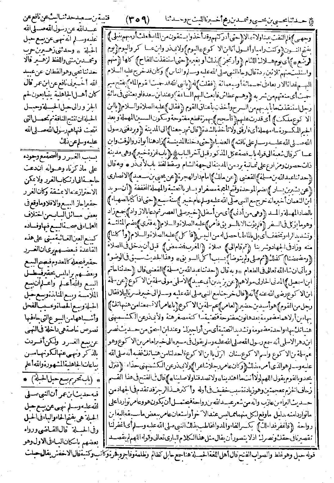 فَقَالَ رَسُولُ اللَّهِ -صَلَّى اللَّهُ عَلَيْهِ وَسَلَّمَ-: «مَنْ هَذَا السَّائِقُ»؟ قَالُوا: عَامِرُ بْنُ الأَكْوَعِ قَالَ: «يَرْحَمُهُ اللَّهُ» قَالَ رَجُلٌ مِنَ الْقَوْمِ: وَجَبَتْ يَا نَبِيَّ اللَّهِ لَوْلاَ أَمْتَعْتَنَا بِهِ فَأَتَيْنَا خَيْبَرَ فَحَاصَرْنَاهُمْ حَتَّى أَصَابَتْنَا مَخْمَصَةٌ شَدِيدَةٌ، ثُمَّ إِنَّ اللَّهَ تَعَالَى فَتَحَهَا عَلَيْهِمْ فَلَمَّا أَمْسَى النَّاسُ مَسَاءَ الْيَوْمِ الَّذِي فُتِحَتْ عَلَيْهِمْ أَوْقَدُوا نِيرَانًا كَثِيرَةً فَقَالَ النَّبِيُّ -صَلَّى اللَّهُ عَلَيْهِ وَسَلَّمَ-: «مَا هَذِهِ النِّيرَانُ؟ عَلَى أَيِّ شَىْءٍ تُوقِدُونَ»؟ قَالُوا: عَلَى لَحْمٍ. قَالَ: «عَلَى أَيِّ لَحْمٍ»؟ قَالُوا: لَحْمِ حُمُرِ الإِنْسِيَّةِ قَالَ النَّبِيُّ -صَلَّى اللَّهُ عَلَيْهِ وَسَلَّمَ-: «أَهْرِيقُوهَا وَاكْسِرُوهَا» فَقَالَ رَجُلٌ: يَا رَسُولَ اللَّهِ أَوْ نُهَرِيقُهَا وَنَغْسِلُهَا قَالَ: «أَوْ ذَاكَ» فَلَمَّا تَصَافَّ الْقَوْمُ كَانَ سَيْفُ عَامِرٍ قَصِيرًا فَتَنَاوَلَ بِهِ سَاقَ يَهُودِيٍّ لِيَضْرِبَهُ وَيَرْجِعُ ذُبَابُ سَيْفِهِ فَأَصَابَ عَيْنَ رُكْبَةِ عَامِرٍ فَمَاتَ مِنْهُ قَالَ: فَلَمَّا قَفَلُوا قَالَ سَلَمَةُ: رَآنِي رَسُولُ اللَّهِ -صَلَّى اللَّهُ عَلَيْهِ وَسَلَّمَ- وَهْوَ آخِذٌ بِيَدِي قَالَ: «مَا لَكَ»؟ قُلْتُ لَهُ: فِدَاكَ أَبِي وَأُمِّي زَعَمُوا أَنَّ عَامِرًا حَبِطَ عَمَلُهُ قَالَ النَّبِيُّ -صَلَّى اللَّهُ عَلَيْهِ وَسَلَّمَ-: «كَذَبَ مَنْ قَالَهُ إِنَّ لَهُ لأَجْرَيْنِ -وَجَمَعَ بَيْنَ إِصْبَعَيْهِ- إِنَّهُ لَجَاهِدٌ مُجَاهِدٌ قَلَّ عَرَبِيٌّ مَشَى بِهَا مِثْلَهُ». حَدَّثَنَا قُتَيْبَةُ حَدَّثَنَا حَاتِمٌ قَالَ: نَشَأَ بِهَا.