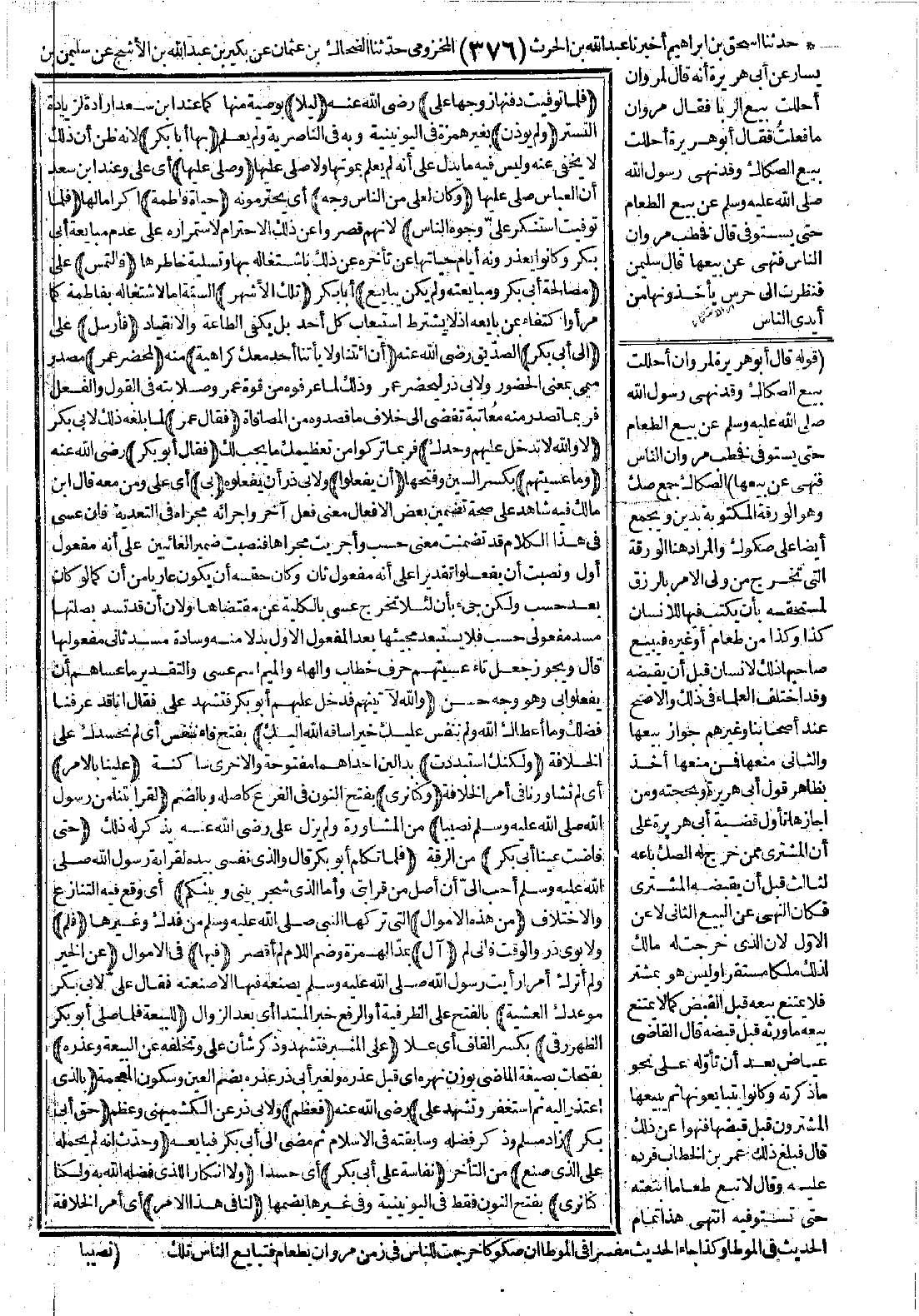 (والله لآتينهم فدخل عليهم أبو بكر فتشهد عليّ فقال: إنّا قد عرفنا فضلك وما أعطاك الله ولم ننفس عليك خيرًا ساقه الله إليك) بفتح فاء ننفس أي لم نحسدك على الخلافة (ولكنك استبددت) بدالين إحداهما مفتوحة والأخرى ساكنة (علينا بالأمر) أي لم تشاورنا في أمر الخلافة (وكنا نرى) بفتح النون في الفرع كأصله وبالضم (لقرابتنا من رسول الله -صَلَّى اللَّهُ عَلَيْهِ وَسَلَّمَ- نصيبًا) من المشاورة ولم يزل علي -رضي الله عنه- يذكر له ذلك (حتى فاضت عينا أبي بكر) من الرقة (فلما تكلم أبو بكر قال: والذي نفسي بيده لقرابة رسول الله -صَلَّى اللَّهُ عَلَيْهِ وَسَلَّمَ- أحبّ إليّ أن أصل من قرابتي، وأما الذي شجر بيني وبينكم) أي وقع فيه التنازع والاختلاف (من هذه الأموال) التي تركها النبي -صَلَّى اللَّهُ عَلَيْهِ وَسَلَّمَ-، من فدك وغيرها (فلم) ولأبوي ذر والوقت فإني لم (آل) بمد الهمزة وضم اللام لم أقصر (فيها) في الأموال (عن الخير ولم أترك أمرًا رأيت رسول الله -صَلَّى اللَّهُ عَلَيْهِ وَسَلَّمَ- يصنعه فيها إلا صنعته. فقال عليّ لأبي بكر: موعدك العشية) بالفتح على الظرفية أو الرفع خبر المبتدأ أي بعد الزوال (للبيعة، فلما صلّى أبو بكر الظهر رقي) بكسر القاف أي علا (المنبر فتشهد وذكر شأن عليّ وتخلفه عن البيعة وعذره) بفتحات بصيغة الماضي بوزن نهره أي قبل عذره ولغير أبي ذر عذره بضم العين وسكون المعجمة (بالذي اعتذر إليه ثم استغفر وتشهد عليّ) -رضي الله عنه- (فعظم) ولأبي ذر عن الكشميهني وعظم (حق أبي بكر) زاد مسلم وذكر فضله وسابقته في الإسلام ثم مضى إلى أبي بكر فبايعه (وحدث أنه لم يحمله على الذي صنع) من التأخر (نفاسة على أبي بكر) أي حسدًا (ولا إنكارًا للذي فضله الله به ولكنا كنا نرى) بفتح النون فقط في اليونينية وفي غيرها بضمها (لنا في هذا الأمر) أي أمر الخلافة
