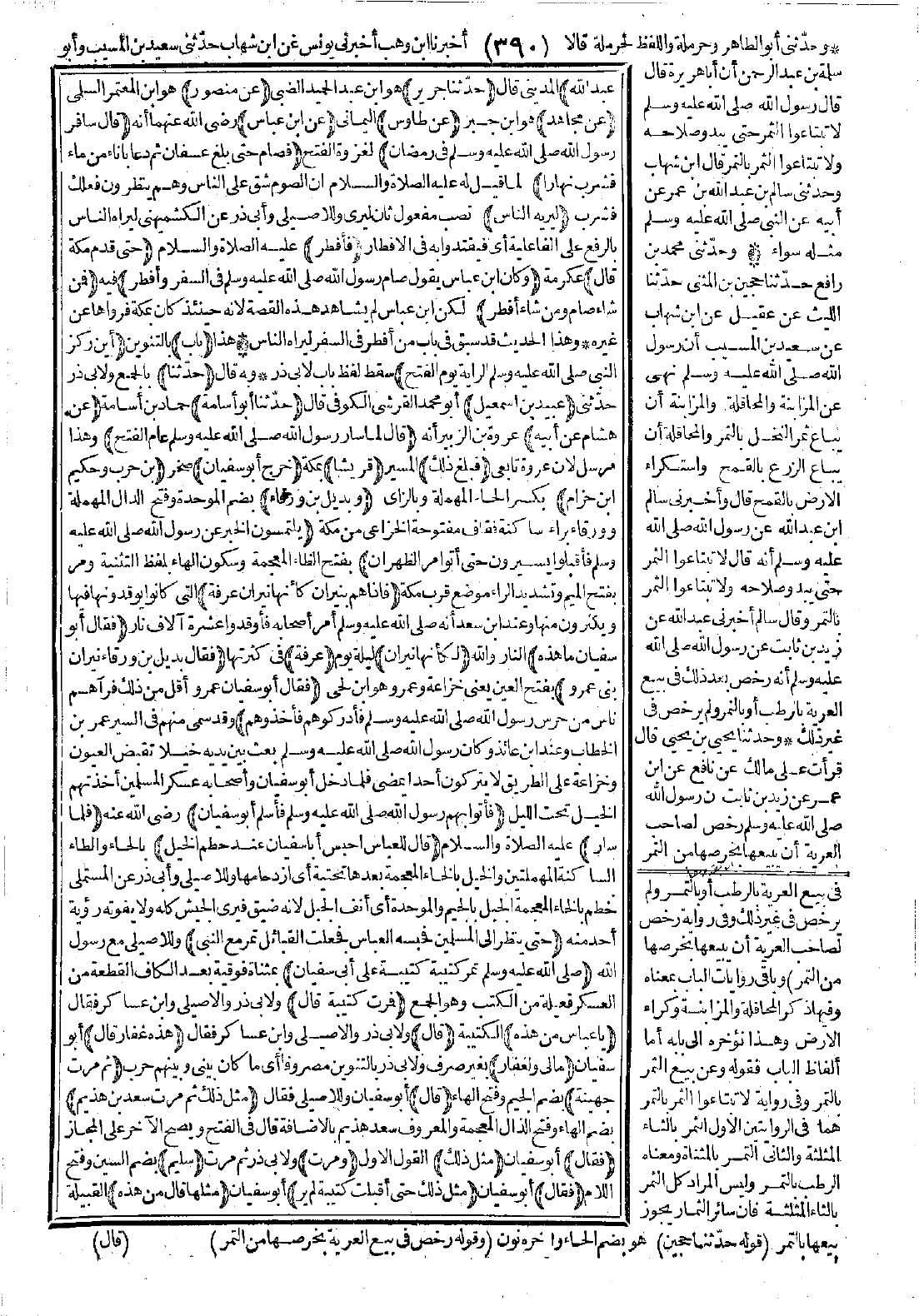 رَسُولُ اللَّهِ -صَلَّى اللَّهُ عَلَيْهِ وَسَلَّمَ- عَامَ الْفَتْحِ فَبَلَغَ ذَلِكَ قُرَيْشًا، خَرَجَ أَبُو سُفْيَانَ بْنُ حَرْبٍ، وَحَكِيمُ بْنُ حِزَامٍ، وَبُدَيْلُ بْنُ وَرْقَاءَ، يَلْتَمِسُونَ الْخَبَرَ عَنْ رَسُولِ اللَّهِ -صَلَّى اللَّهُ عَلَيْهِ وَسَلَّمَ- فَأَقْبَلُوا يَسِيرُونَ حَتَّى أَتَوْا مَرَّ الظَّهْرَانِ فَإِذَا هُمْ بِنِيرَانٍ كَأَنَّهَا نِيرَانُ عَرَفَةَ، فَقَالَ أَبُو سُفْيَانَ: مَا هَذِهِ لَكَأَنَّهَا نِيرَانُ عَرَفَةَ؟ فَقَالَ بُدَيْلُ بْنُ وَرْقَاءَ: نِيرَانُ بَنِي عَمْرٍو، فَقَالَ أَبُو سُفْيَانَ: عَمْرٌو أَقَلُّ مِنْ ذَلِكَ، فَرَآهُمْ نَاسٌ مِنْ حَرَسِ رَسُولِ اللَّهِ -صَلَّى اللَّهُ عَلَيْهِ وَسَلَّمَ- فَأَدْرَكُوهُمْ فَأَخَذُوهُمْ فَأَتَوْا بِهِمْ رَسُولَ اللَّهِ -صَلَّى اللَّهُ عَلَيْهِ وَسَلَّمَ-، فَأَسْلَمَ أَبُو سُفْيَانَ، فَلَمَّا سَارَ قَالَ لِلْعَبَّاسِ: «احْبِسْ أَبَا سُفْيَانَ عِنْدَ حَطْمِ الْخَيْلِ حَتَّى يَنْظُرَ إِلَى الْمُسْلِمِينَ» فَحَبَسَهُ الْعَبَّاسُ فَجَعَلَتِ الْقَبَائِلُ تَمُرُّ مَعَ النَّبِيِّ -صَلَّى اللَّهُ عَلَيْهِ وَسَلَّمَ- كَتِيبَةً كَتِيبَةً، عَلَى أَبِي سُفْيَانَ فَمَرَّتْ كَتِيبَةٌ قَالَ يَا عَبَّاسُ مَنْ هَذِهِ؟ قَالَ: هَذِهِ غِفَارُ قَالَ: مَا لِي وَلِغِفَارَ؟ ثُمَّ مَرَّتْ جُهَيْنَةُ، قَالَ مِثْلَ ذَلِكَ، ثُمَّ مَرَّتْ سَعْدُ بْنُ هُذَيْمٍ فَقَالَ مِثْلَ ذَلِكَ، وَمَرَّتْ سُلَيْمُ فَقَالَ مِثْلَ ذَلِكَ، حَتَّى أَقْبَلَتْ كَتِيبَةٌ لَمْ يَرَ مِثْلَهَا قَالَ مَنْ هَذِهِ؟ قَالَ: هَؤُلاَءِ الأَنْصَارُ عَلَيْهِمْ سَعْدُ بْنُ عُبَادَةَ مَعَهُ الرَّايَةُ، فَقَالَ سَعْدُ بْنُ عُبَادَةَ: يَا أَبَا سُفْيَانَ الْيَوْمُ يَوْمُ الْمَلْحَمَةِ الْيَوْمَ تُسْتَحَلُّ الْكَعْبَةُ، فَقَالَ أَبُو سُفْيَانَ: يَا عَبَّاسُ حَبَّذَا يَوْمُ الذِّمَارِ ثُمَّ جَاءَتْ كَتِيبَةٌ وَهْيَ أَقَلُّ الْكَتَائِبِ فِيهِمْ رَسُولُ اللَّهِ -صَلَّى اللَّهُ عَلَيْهِ وَسَلَّمَ- وَأَصْحَابُهُ وَرَايَةُ النَّبِيِّ -صَلَّى اللَّهُ عَلَيْهِ وَسَلَّمَ- مَعَ الزُّبَيْرِ بْنِ الْعَوَّامِ، فَلَمَّا مَرَّ رَسُولُ اللَّهِ -صَلَّى اللَّهُ عَلَيْهِ وَسَلَّمَ- بِأَبِي سُفْيَانَ قَالَ: أَلَمْ تَعْلَمْ مَا قَالَ سَعْدُ بْنُ عُبَادَةَ؟ قَالَ: «مَا قَالَ»؟ قَالَ: قَالَ: كَذَا وَكَذَا، فَقَالَ: «كَذَبَ سَعْدٌ وَلَكِنْ هَذَا يَوْمٌ يُعَظِّمُ اللَّهُ فِيهِ الْكَعْبَةَ وَيَوْمٌ تُكْسَى فِيهِ الْكَعْبَةُ» قَالَ: وَأَمَرَ رَسُولُ اللَّهِ -صَلَّى اللَّهُ عَلَيْهِ وَسَلَّمَ- أَنْ تُرْكَزَ رَايَتُهُ بِالْحَجُونِ. قَالَ عُرْوَةُ: وَأَخْبَرَنِي نَافِعُ بْنُ جُبَيْرِ بْنِ مُطْعِمٍ، قَالَ: سَمِعْتُ الْعَبَّاسَ يَقُولُ: لِلزُّبَيْرِ بْنِ الْعَوَّامِ: يَا أَبَا عَبْدِ اللَّهِ هَا هُنَا أَمَرَكَ رَسُولُ اللَّهِ -صَلَّى اللَّهُ عَلَيْهِ وَسَلَّمَ- أَنْ تَرْكُزَ الرَّايَةَ، قَالَ: وَأَمَرَ رَسُولُ اللَّهِ -صَلَّى اللَّهُ عَلَيْهِ وَسَلَّمَ- يَوْمَئِذٍ خَالِدَ بْنَ الْوَلِيدِ أَنْ يَدْخُلَ مِنْ أَعْلَى مَكَّةَ مِنْ كَدَاءٍ وَدَخَلَ النَّبِيُّ -صَلَّى اللَّهُ عَلَيْهِ وَسَلَّمَ- مِنْ كُدًى فَقُتِلَ مِنْ خَيْلِ خَالِدٍ يَوْمَئِذٍ رَجُلاَنِ حُبَيْشُ بْنُ الأَشْهَرِ وَكُرْزُ بْنُ جَابِرٍ الْفِهْرِيُّ.