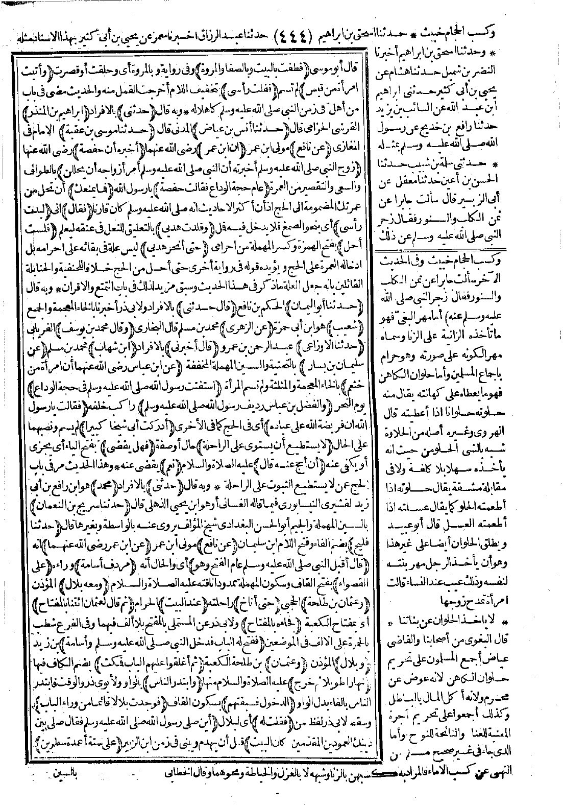 4400 - حَدَّثَنِي مُحَمَّدٌ حَدَّثَنَا سُرَيْجُ بْنُ النُّعْمَانِ، حَدَّثَنَا فُلَيْحٌ عَنْ نَافِعٍ، عَنِ ابْنِ عُمَرَ -رضي الله عنهما- قَالَ: أَقْبَلَ النَّبِيُّ -صَلَّى اللَّهُ عَلَيْهِ وَسَلَّمَ- عَامَ الْفَتْحِ وَهْوَ مُرْدِفٌ أُسَامَةَ عَلَى الْقَصْوَاءِ وَمَعَهُ بِلاَلٌ وَعُثْمَانُ بْنُ طَلْحَةَ، حَتَّى أَنَاخَ عِنْدَ الْبَيْتِ ثُمَّ قَالَ لِعُثْمَانَ: «ائْتِنَا بِالْمِفْتَاحِ» فَجَاءَهُ بِالْمِفْتَاحِ فَفَتَحَ لَهُ الْبَابَ فَدَخَلَ النَّبِيُّ -صَلَّى اللَّهُ عَلَيْهِ وَسَلَّمَ- وَأُسَامَةُ وَبِلاَلٌ وَعُثْمَانُ ثُمَّ أَغْلَقُوا عَلَيْهِمِ الْبَابَ فَمَكَثَ نَهَارًا طَوِيلاً ثُمَّ خَرَجَ وَابْتَدَرَ النَّاسُ الدُّخُولَ فَسَبَقْتُهُمْ فَوَجَدْتُ بِلاَلاً قَائِمًا مِنْ وَرَاءِ الْبَابِ فَقُلْتُ لَهُ: أَيْنَ صَلَّى رَسُولُ اللَّهِ -صَلَّى اللَّهُ عَلَيْهِ وَسَلَّمَ-؟ فَقَالَ: صَلَّى بَيْنَ ذَيْنِكَ الْعَمُودَيْنِ الْمُقَدَّمَيْنِ، وَكَانَ الْبَيْتُ عَلَى سِتَّةِ أَعْمِدَةٍ سَطْرَيْنِ صَلَّى بَيْنَ الْعَمُودَيْنِ مِنَ السَّطْرِ الْمُقَدَّمِ، وَجَعَلَ بَابَ الْبَيْتِ خَلْفَ ظَهْرِهِ، وَاسْتَقْبَلَ بِوَجْهِهِ الَّذِي يَسْتَقْبِلُكَ حِينَ تَلِجُ الْبَيْتَ بَيْنَهُ وَبَيْنَ الْجِدَارِ، قَالَ: وَنَسِيتُ أَنْ أَسْأَلَهُ كَمْ صَلَّى؟ وَعِنْدَ الْمَكَانِ الَّذِي صَلَّى فِيهِ مَرْمَرَةٌ حَمْرَاءُ.