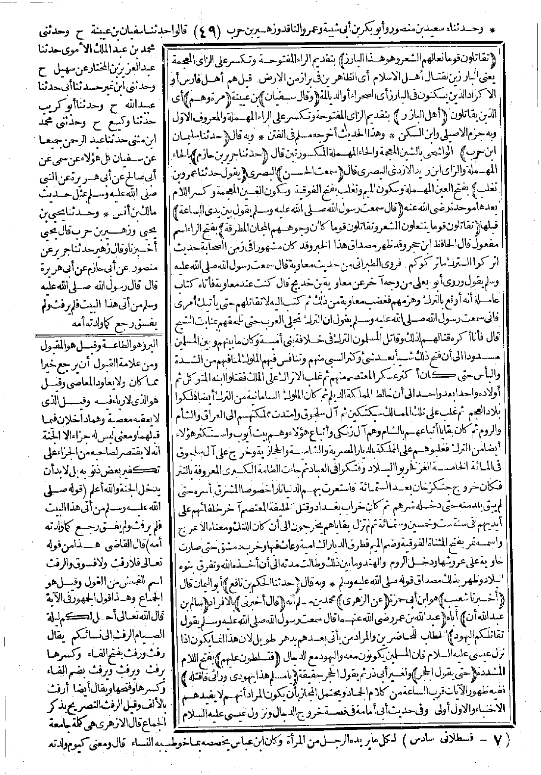 (بين يدي الساعة) قبلها (تقاتلون قومًا ينتعلون الشعر وتقاتلون قومًا كان وجوههم المجان المطرقة) بفتح الراء اسم مفعول. قال الحافظ ابن حجر: وقد ظهر مصداق هذا الخبر وقد كان مشهورًا في زمن الصحابة حديث: اتركوا الترك ما تركوكم، فروى الطبراني من حديث معاوية قال: سمعت رسول الله -صَلَّى اللَّهُ عَلَيْهِ وَسَلَّمَ- يقول.