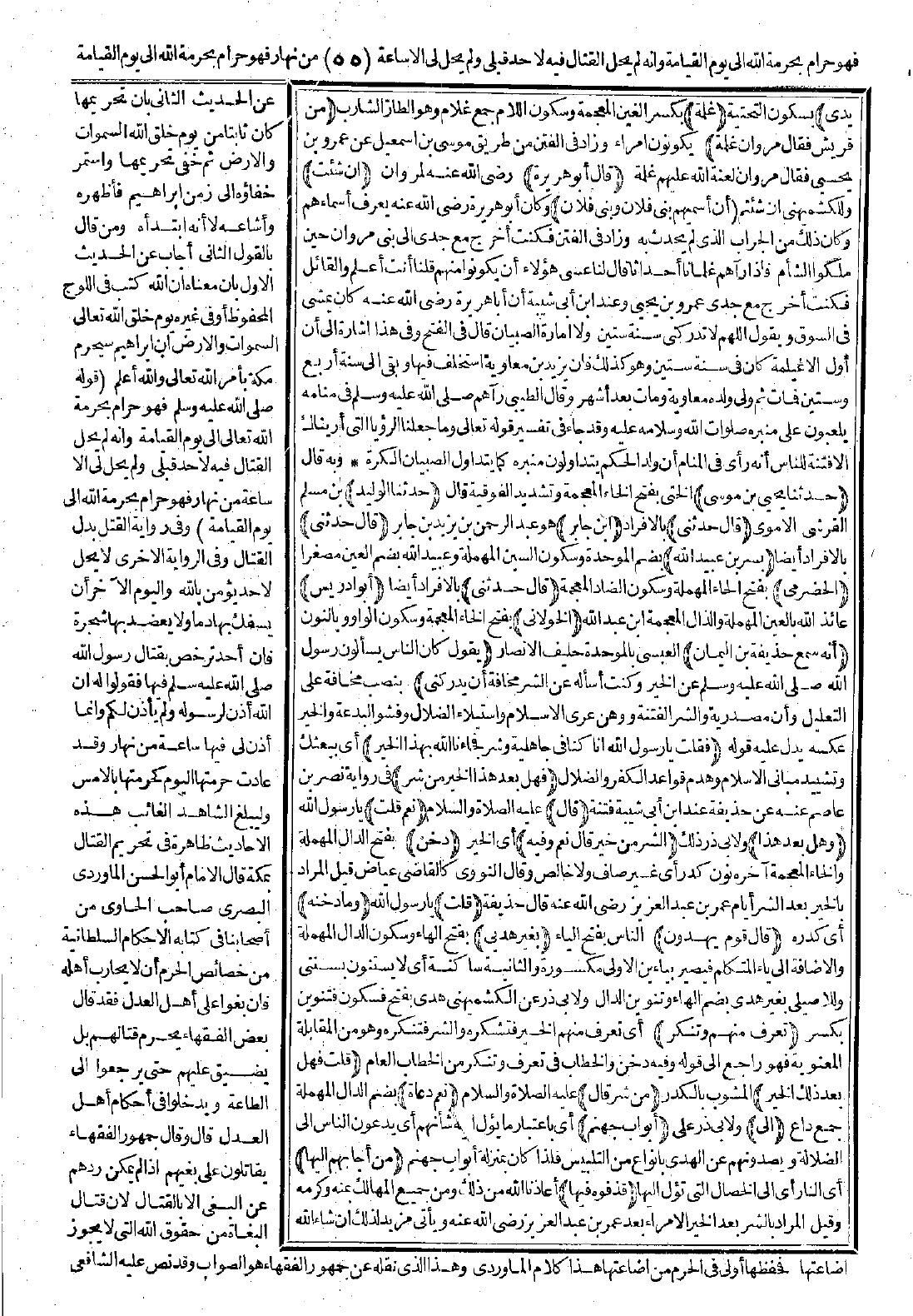 (نعم) (قلت) يا رسول الله (وهل بعد هذا) ولأبي ذر ذلك (الشر من خير؟ قال: نعم وفيه) أي الخير (دخن) بفتح الدال المهملة والخاء المعجمة آخره نون كدر أي غير صاف ولا خالص. وقال النووي كالقاضي عياض قيل المراد بالخير بعد الشر أيام عمر بن عبد العزيز -رضي الله عنه-. قال حذيفة (قلت) يا رسول الله (وما دخنه؟) أي كدره (قال): (قوم يهدون) الناس بفتح الياء (بغير هديي) بفتح الهاء وسكون الدال المهملة والإضافة إلى ياء المتكلم فيصير بياءين الأولى مكسورة والثانية ساكنة أي لا يستنون بسنتي، وللأصيلي بغير هُدى بضم الهاء وتنوين الدال، ولأبي ذر عن الكشميهني: هدى بفتح فسكون فتنوين بكسر (تعرف منهم وتنكر) أي تعرف منهم الخير فتشكره والشر فتنكره وهو من المقابلة المعنوية فهو راجع إلى قوله: وفيه دخن، والخطاب في تعرف وتنكر من الخطاب العام. (قلت: فهل بعد ذلك الخير) المشوب بالكدر (من شر؟ قال): عليه الصلاة والسلام (نعم دعاة) بضم الدال المهملة جمع داع (إلى) ولأبي ذر على (أبواب جهنم) أي باعتبار ما يؤول إليه شأنهم أي يدعون الناس إلى الضلالة ويصدونهم عن الهدى بأنواع من التلبيس، فلذا كان بمنزلة أبواب جهنم (من أجابهم إليها) أي النار أي إلى الخصال التي تؤول إليها (قذفوه فيها) أعاذنا الله من ذلك ومن جميع المهالك بمنّه وكرمه. وقيل: المراد بالشر بعد الخير الأمر بعد عمر بن عبد العزيز -رضي الله عنه-. ويأتي مزيد لذلك إن شاء الله