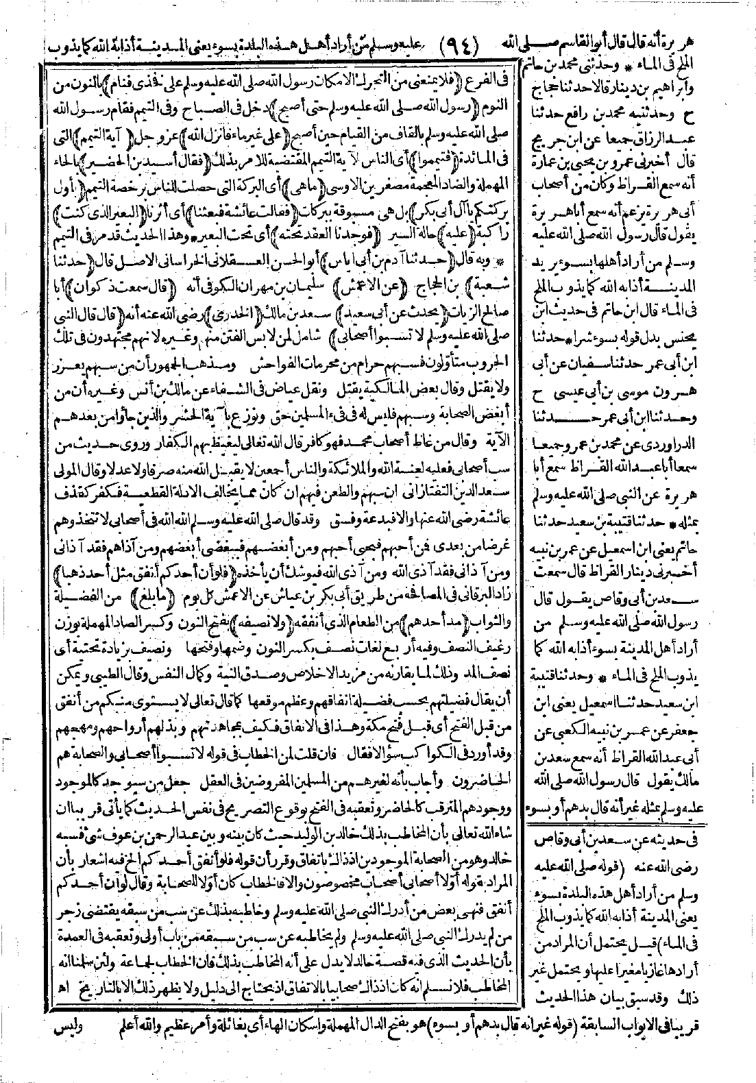 الصحابة وسبهم فليس له في فيء المسلمين حق، ونوزع بآية الحشر {والذين جاؤوا من بعدهم} [الحشر: 10] الآية. وقال من غاظ أصحاب محمد فهو كافر. قال الله تعالى: {ليغيظ بهم الكفار} [الفتح: 27]. وروي حديث: "من يسب أصحابي فعليه لعنة الله والملائكة والناس أجمعين لا يقبل الله منه صرفًا ولا عدلاً". وقال المولى سعد الدين التفتازاني: إن سبهم والطعن فيهم إن كان مما يخالف الأدلة القطعية فكفر كقذف عائشة -رضي الله عنها- وإلاّ فبدعة وفسق، وقد قال -صَلَّى اللَّهُ عَلَيْهِ وَسَلَّمَ- "الله الله في أصحابي لا تتخذوهم غرضًا من بعدي فمن أحبهم فبحبي أحبهم ومن أبغضهم فببغضي أبغضهم، ومن آذاهم فقد آذاني ومن آذاني فقد آذى الله ومن آذى الله فيوشك أن يأخذه".
