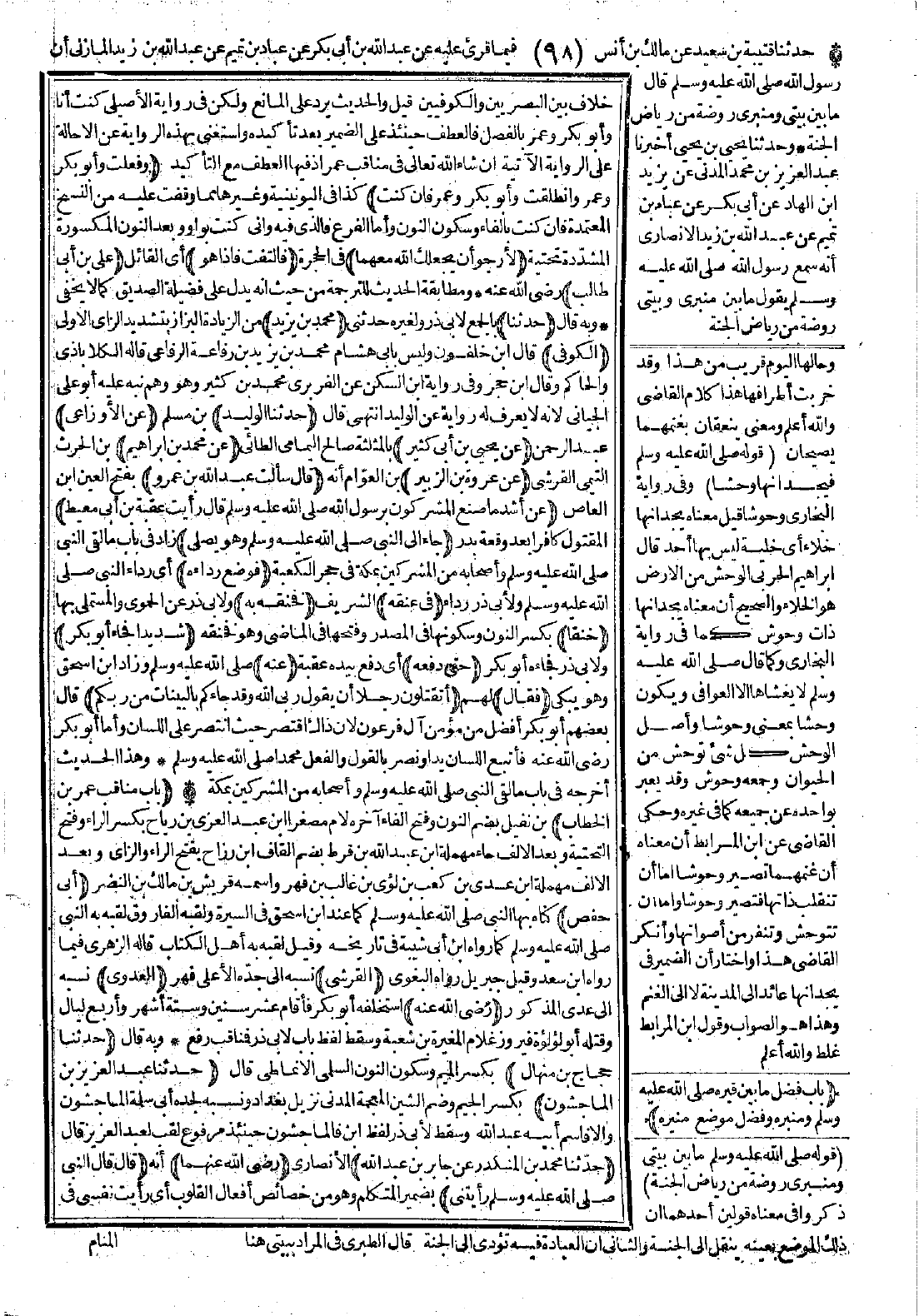 وبه قال: (حدّثنا حجاج بن منهال) بكسر الميم وسكون النون السلمي الأنماطي قال: (حدّثنا عبد العزيز بن الماجشون) بكسر الجيم وضم الشين المعجمة المدني نزيل بغداد ونسبه لجده أبي سلمة الماجشون وإلاّ فاسم أبيه عبد الله وسقط لأبي ذر لفظ ابن فالماجشون حينئذٍ مرفوع لقب لعبيد العزيز قال: (حدّثنا محمد بن المنكدر عن جابر بن عبد الله) الأنصاري (-رضي الله عنهما-) أنه (قال: قال النبي -صَلَّى اللَّهُ عَلَيْهِ وَسَلَّمَ-):
