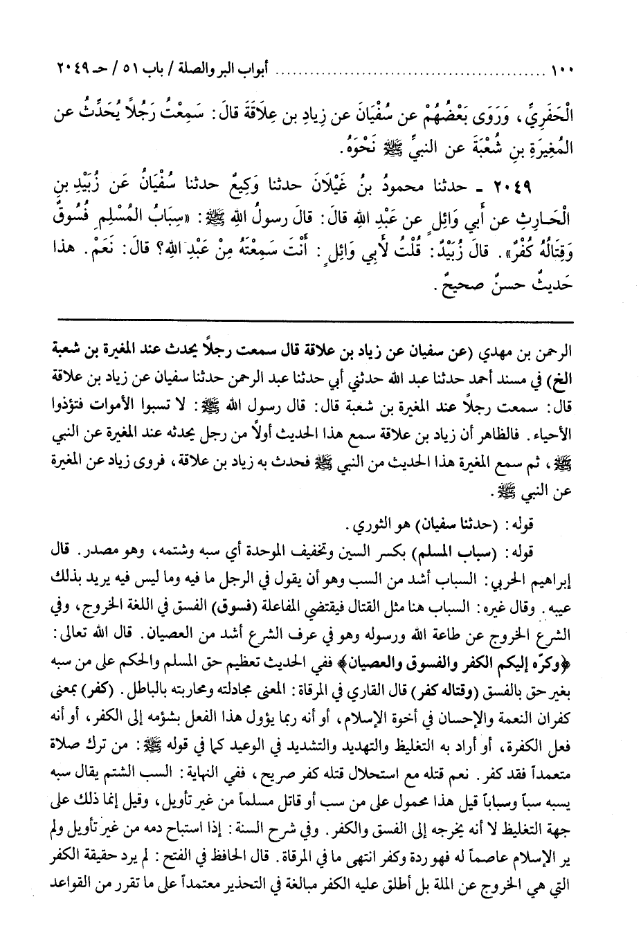 الرَّحْمَنِ بْنُ مَهْدِيٍّ (عَنْ سُفْيَانَ عَنْ زِيَادِ بْنِ عِلَاقَةَ قَالَ سَمِعْتُ رَجُلًا يُحَدِّثُ عِنْدَ الْمُغِيرَةِ بْنَ شُعْبَةَ إِلَخْ) فِي مُسْنَدِ أَحْمَدَ حَدَّثَنَا عَبْدُ اللَّهِ حَدَّثَنِي أَبِي حَدَّثَنَا عَبْدُ الرَّحْمَنِ حَدَّثَنَا سُفْيَانُ عَنْ زِيَادِ بْنِ عِلَاقَةَ قَالَ سَمِعْتُ رَجُلًا عِنْدَ الْمُغِيرَةِ بْنِ شُعْبَةَ قَالَ قَالَ رَسُولُ اللَّهِ صَلَّى اللَّهُ عَلَيْهِ وَسَلَّمَ لَا تَسُبُّوا الْأَمْوَاتَ فَتُؤْذُوا الْأَحْيَاءَ