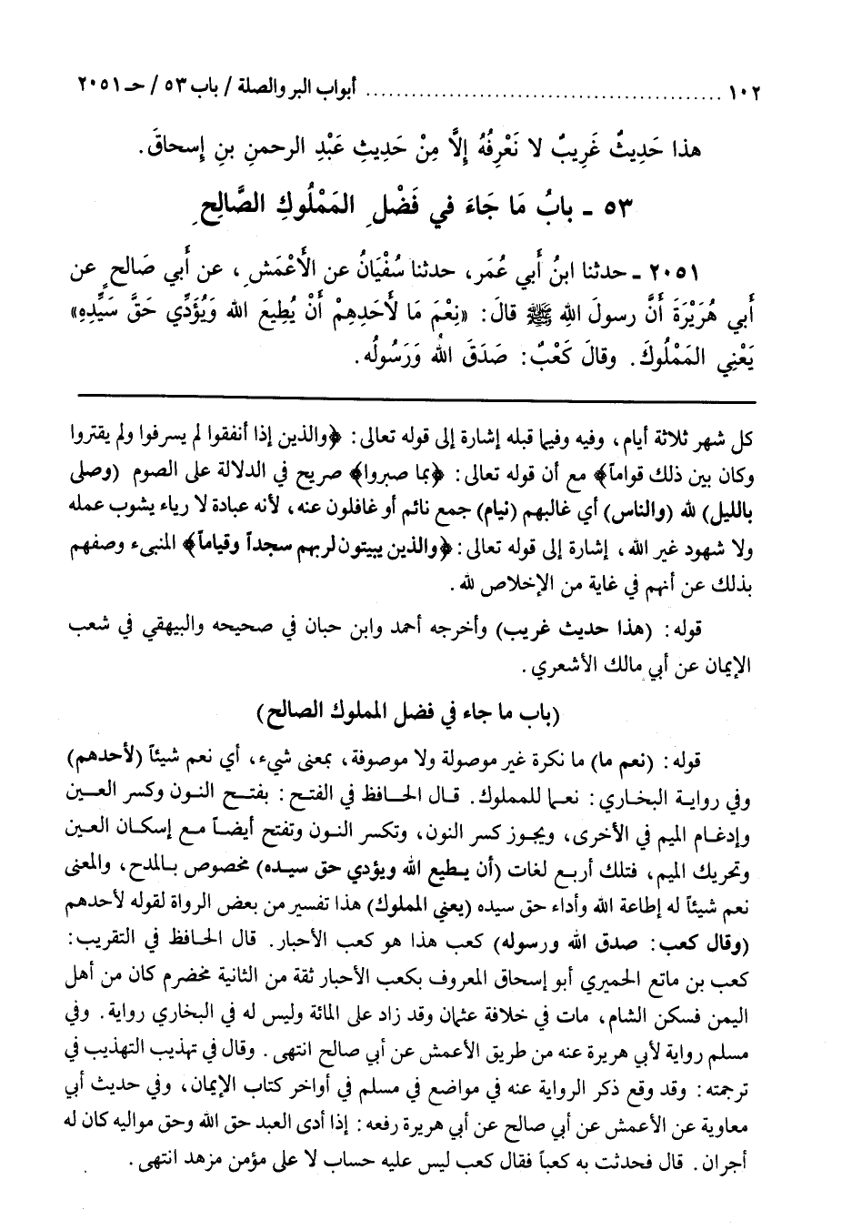 وَقَالَ فِي تَهْذِيبِ التَّهْذِيبِ فِي تَرْجَمَتِهِ وَقَدْ وَقَعَ ذِكْرُ الرِّوَايَةِ عَنْهُ فِي مَوَاضِعَ فِي مُسْلِمٍ فِي أَوَاخِرِ كِتَابِ الْإِيمَانِ وَفِي حَدِيثِ أَبِي مُعَاوِيَةَ عَنِ الْأَعْمَشِ عَنْ أَبِي صَالِحٍ عَنْ أَبِي هُرَيْرَةَ رَفَعَهُ إِذَا أَدَّى الْعَبْدُ حَقَّ اللَّهِ وَحَقَّ مَوَالِيهِ كَانَ لَهُ أَجْرَانِ