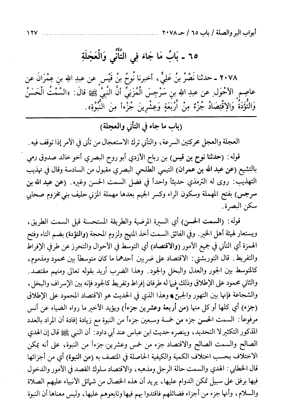 قَوْلُهُ [2010] (حَدَّثَنَا نُوحُ بْنُ قَيْسِ) بْنِ رَبَاحٍ الْأَزْدِيُّ أَبُو رَوْحٍ الْبَصْرِيُّ أَخُو خَالِدٍ صَدُوقٌ رُمِيَ بِالتَّشَيُّعِ (عَنْ عَبْدِ اللَّهِ بْنِ عِمْرَانَ) التَّيْمِيِّ الطَّلْحِيِّ الْبَصْرِيِّ مَقْبُولٌ مِنَ السَّادِسَةِ وَقَالَ فِي تَهْذِيبِ التَّهْذِيبِ رَوَى لَهُ التِّرْمِذِيُّ حَدِيثًا وَاحِدًا فِي فَضْلِ السَّمْتِ الْحَسَنِ وَغَيْرِهِ