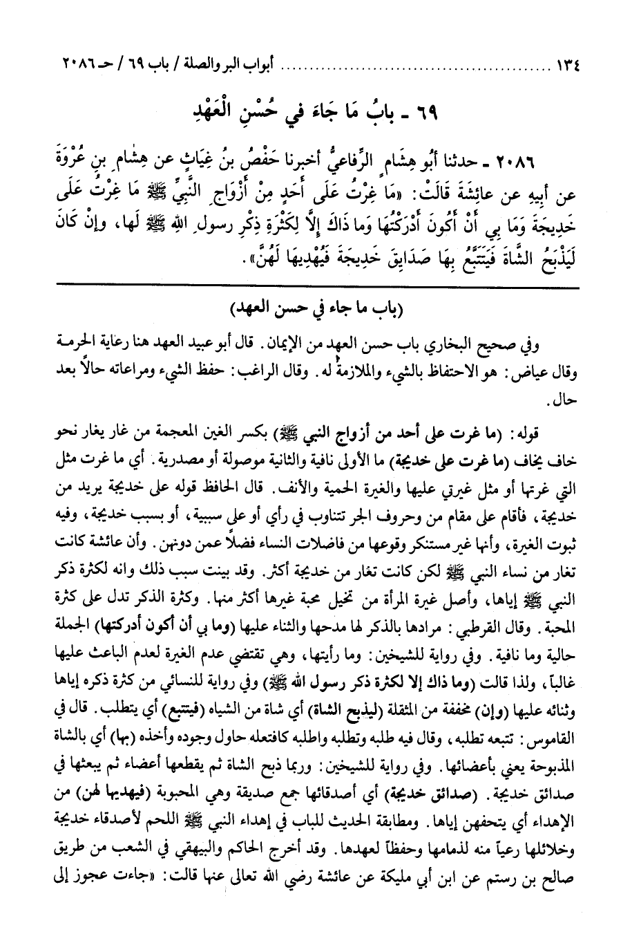 وَقَالَ الْقُرْطُبِيُّ مُرَادُهَا بِالذِّكْرِ لَهَا مَدْحُهَا وَالثَّنَاءُ عَلَيْهَا (وَمَا بِي أَنْ أَكُونَ أَدْرَكْتُهَا) الْجُمْلَةُ حَالِيَّةٌ وَمَا نَافِيَةٌ وَفِي رِوَايَةٍ لِلشَّيْخَيْنِ وَمَا رَأَيْتُهَا وَهِيَ تَقْتَضِي عَدَمَ الْغَيْرَةِ لِعَدَمِ الْبَاعِثِ عَلَيْهَا غَالِبًا وَلِذَا قَالَتْ (وَمَا ذَاكَ إِلَّا لِكَثْرَةِ ذِكْرِ رَسُولِ اللَّهِ صَلَّى اللَّهُ عَلَيْهِ وَسَلَّمَ لَهَا) وَفِي رِوَايَةٍ لِلنَّسَائِيِّ مِنْ كَثْرَةِ ذِكْرِهِ إِيَّاهَا وَثَنَائِهِ عَلَيْهَا (وإن) من مخففة الْمُثَقَّلَةِ (لَيَذْبَحُ الشَّاةَ) أَيَّ شَاةٍ مِنَ الشِّيَاهِ (فَيَتَتَبَّعُ) أَيْ يَتَطلَّبُ