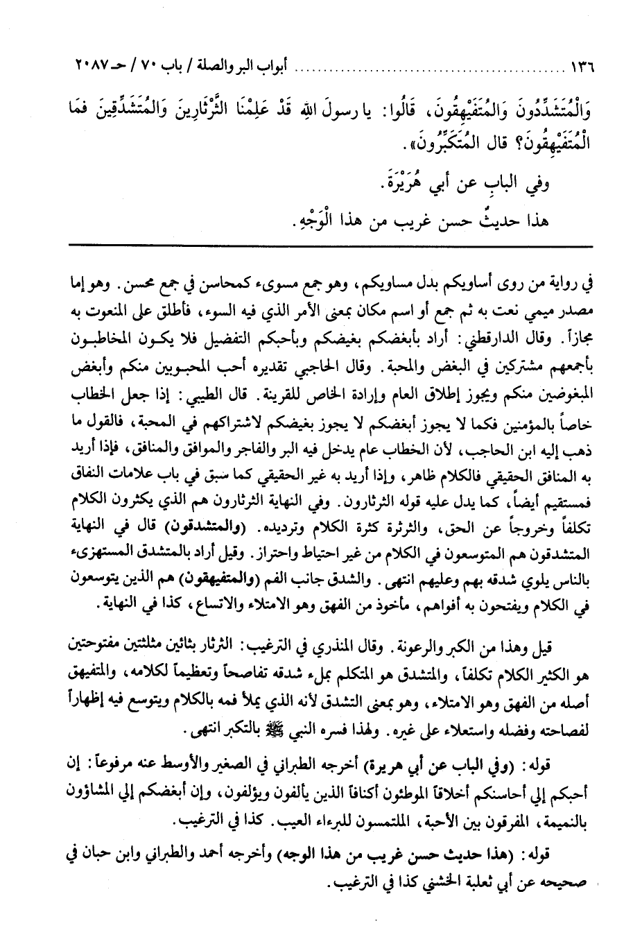 وَقَالَ الْمُنْذِرِيُّ فِي الترغيب الثرثار بثائين مثلثين مَفْتُوحَتَيْنِ هُوَ الْكَثِيرُ الْكَلَامِ تَكَلُّفًا وَالْمُتَشَدِّقُ هُوَ المتكلم بملىء شَدْقِهِ تَفَاصُحًا وَتَعْظِيمًا لِكَلَامِهِ وَالْمُتَفَيْهِقُ أَصْلُهُ مِنَ الْفَهْقِ وَهُوَ الِامْتِلَاءُ وَهُوَ بِمَعْنَى الْمُتَشَدِّقِ لِأَنَّهُ الَّذِي يَمْلَأُ فَمَهُ بِالْكَلَامِ وَيَتَوَسَّعُ فِيهِ إِظْهَارًا لِفَصَاحَتِهِ وَفَضْلِهِ وَاسْتِعْلَاءً عَلَى غَيْرِهِ