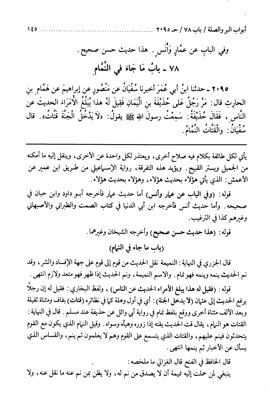 قَالَ الْحَافِظُ فِي الْفَتْحِ قَالَ الْغَزَالِيُّ مَا مُلَخَّصُهُ يَنْبَغِي لِمَنْ حُمِلَتْ إِلَيْهِ نَمِيمَةٌ أَنْ لَا يُصَدِّقَ مَنْ نَمَّ لَهُ وَلَا يَظُنُّ بِمَنْ نَمَّ عَنْهُ مَا نُقِلَ عَنْهُ ولا