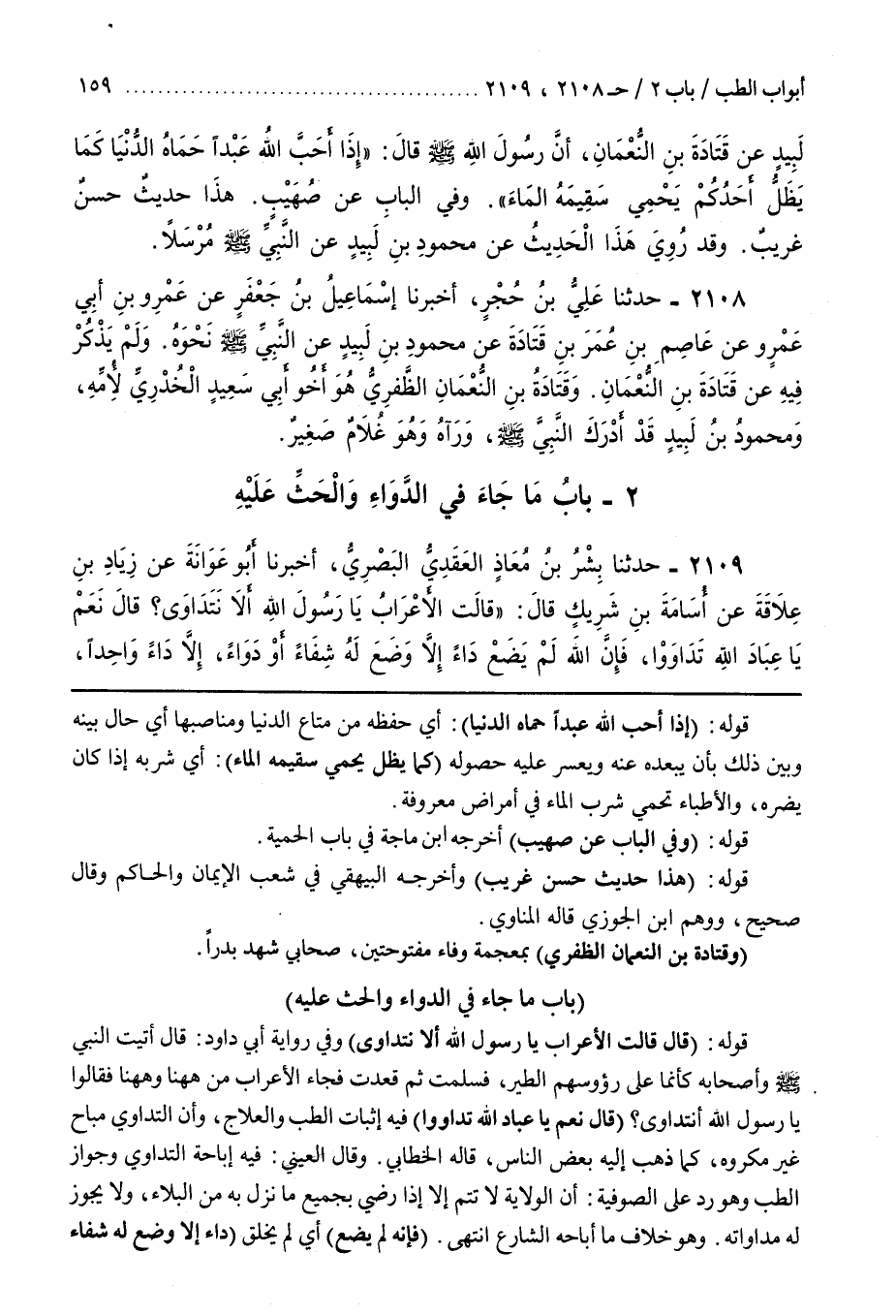قَوْلُهُ [2038] (قَالَ قَالَتِ الْأَعْرَابُ يَا رَسُولَ اللَّهِ أَلَا نَتَدَاوَى) وَفِي رِوَايَةِ أَبِي دَاوُدَ قَالَ أَتَيْتُ النَّبِيَّ صَلَّى اللَّهُ عَلَيْهِ وَسَلَّمَ وَأَصْحَابُهُ كأنما على رؤوسهم الطَّيْرُ فَسَلَّمْتُ ثُمَّ قَعَدْتُ فَجَاءَ الْأَعْرَابُ مِنْ ها هنا وههنا فَقَالُوا يَا رَسُولَ اللَّهِ أَنَتَدَاوَى (قَالَ نَعَمْ يَا عِبَادَ اللَّهِ تَدَاوَوْا) فِيهِ إِثْبَاتُ الطِّبِّ وَالْعِلَاجِ وَأَنَّ التَّدَاوِي مُبَاحٌ غَيْرُ مَكْرُوهٍ