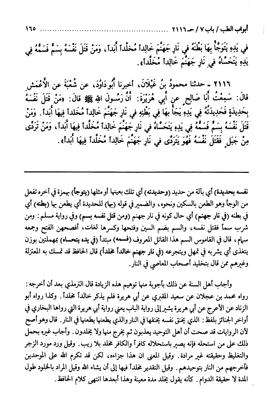 وَكَذَا رَوَاهُ أَبُو الزِّنَادِ عَنِ الْأَعْرَجِ عَنْ أَبِي هُرَيْرَةَ يُشِيرُ إِلَى رِوَايَةِ الْبَابِ يَعْنِي رِوَايَةَ أَبِي هُرَيْرَةَ الَّتِي رَوَاهَا الْبُخَارِيُّ فِي أَوَاخِرِ الْجَنَائِزِ بِلَفْظِ الَّذِي يَخْنُقُ نَفْسَهُ يَخْنُقُهَا فِي النَّارِ وَالَّذِي يَطْعَنُهَا يَطْعَنُهَا فِي النَّارِ