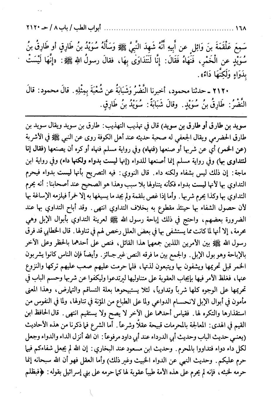 سُوَيْدُ بْنُ طَارِقٍ أَوْ طَارِقُ بْنُ سُوَيْدٍ) قَالَ فِي تَهْذِيبِ التَّهْذِيبِ طَارِقُ بْنُ سُوَيْدٍ وَيُقَالُ سُوَيْدُ بْنُ طَارِقٍ الْحَضْرَمِيُّ وَيُقَالُ الْجُعْفِيُّ لَهُ صُحْبَةٌ حَدِيثُهُ عِنْدَ أَهْلِ الْكُوفَةِ رَوَى عَنِ النَّبِيِّ صَلَّى اللَّهُ عَلَيْهِ وَسَلَّمَ فِي الْأَشْرِبَةِ (عَنِ الْخَمْرِ) أَيْ عَنْ شُرْبِهَا أَوْ صُنْعِهَا (فَنَهَاهُ) وَفِي رِوَايَةِ مُسْلِمٍ فَنَهَاهُ أَوْ كَرِهَ أَنْ يَصْنَعَهَا (فَقَالَ إِنَّا لَنَتَدَاوَى بِهَا) وَفِي رِوَايَةِ مُسْلِمٍ إِنَّمَا أَصْنَعُهَا لِلدَّوَاءِ (إِنَّهَا ليست بدواء ولكنها داء) وفي رواية بن مَاجَهْ إِنَّ ذَلِكَ لَيْسَ بِشِفَاءٍ وَلَكِنَّهُ دَاءٌ