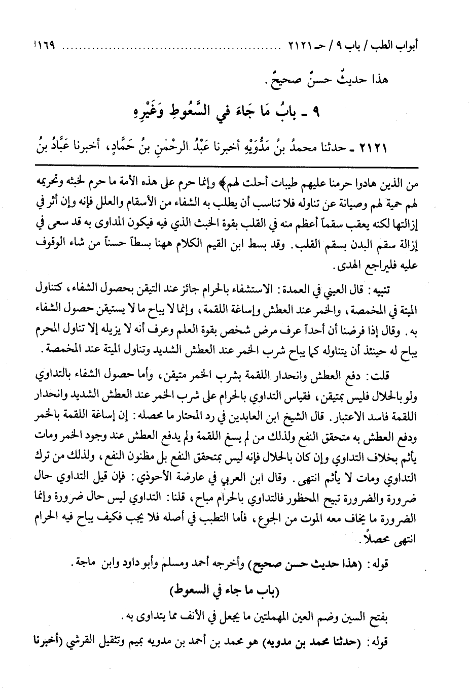 وَقَالَ بن الْعَرَبِيِّ فِي عَارِضَةِ الْأَحْوَذِيِّ فَإِنْ قِيلَ التَّدَاوِي حَالُ ضَرُورَةٍ وَالضَّرُورَةُ تُبِيحُ الْمَحْظُورَ فَالتَّدَاوِي بِالْحَرَامِ مُبَاحٌ قُلْنَا التَّدَاوِي لَيْسَ حَالَ ضَرُورَةٍ وَإِنَّمَا الضَّرُورَةُ مَا يُخَافُ مَعَهُ الْمَوْتُ مِنَ الْجُوعِ فَأَمَّا التَّطَبُّبُ فِي أَصْلِهِ فَلَا يَجِبُ فَكَيْفَ يُبَاحُ فِيهِ الْحَرَامُ انْتَهَى مُحَصَّلًا