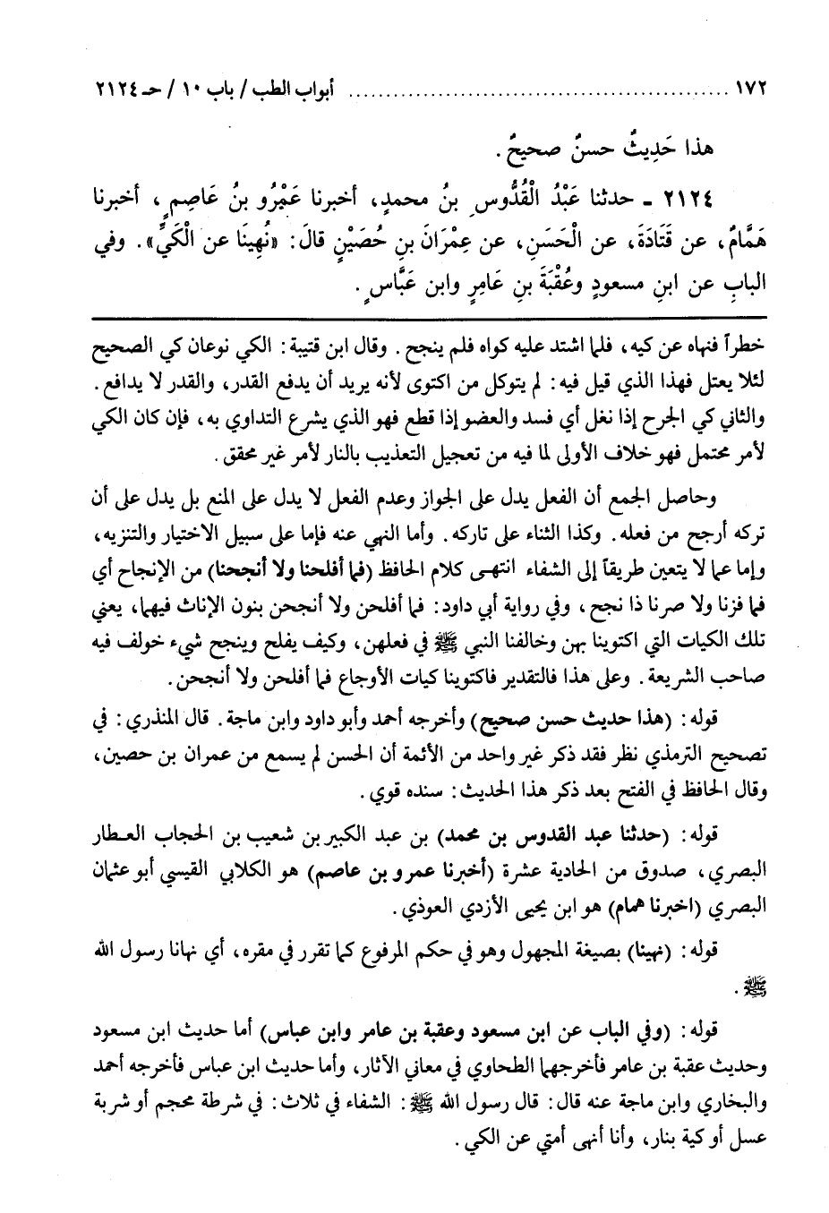 قوله (وفي الباب عن بن مسعود وعقبة بن عامر وبن عباس) أما حديث بن مسعود وحديث عقبة بن عامر فأخر جهما الطحاوي في معاني الاثار وأما حديث بن عباس فأخرجه أحمد والبخاري وبن مَاجَهْ عَنْهُ قَالَ قَالَ رَسُولُ اللَّهِ صَلَّى اللَّهُ عَلَيْهِ وَسَلَّمَ الشِّفَاءُ فِي ثَلَاثٍ فِي شَرْطَةِ مِحْجَمٍ أَوْ شَرْبَةِ عَسَلٍ أَوْ كَيَّةٍ بِنَارٍ وَأَنَا أَنْهَى أُمَّتِي عَنِ الْكَيِّ