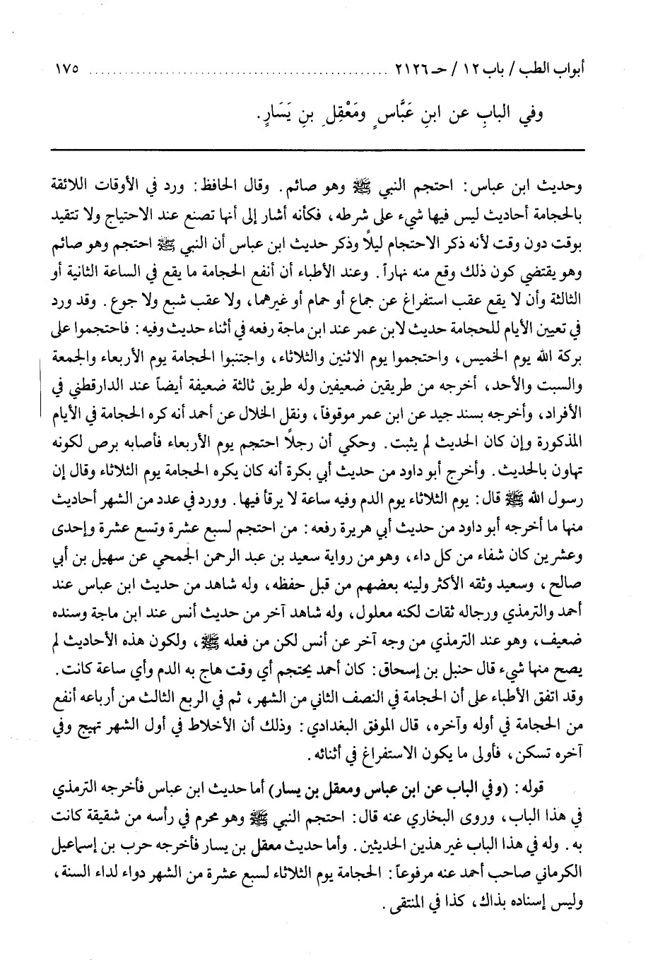 وَهُوَ مِنْ رِوَايَةِ سَعِيدِ بْنِ عَبْدِ الرَّحْمَنِ الْجُمَحِيِّ عَنْ سُهَيْلِ بْنِ أَبِي صَالِحٍ وَسَعِيدٌ وَثَّقَهُ الْأَكْثَرُ وَلَيَّنَهُ بَعْضُهُمْ مِنْ قِبَلِ حِفْظِهِ وَلَهُ شَاهِدٌ مِنْ حديث بن عَبَّاسٍ عِنْدَ أَحْمَدَ وَالتِّرْمِذِيِّ وَرِجَالُهُ ثِقَاتٌ لَكِنَّهُ مَعْلُولٌ وَلَهُ شَاهِدٌ آخِرُ مِنْ حَدِيثِ أَنَسٍ عند بن مَاجَهْ وَسَنَدُهُ ضَعِيفٌ وَهُوَ عِنْدَ التِّرْمِذِيِّ مِنْ وَجْهٍ آخَرَ عَنْ أَنَسٍ لَكِنْ مِنْ فِعْلِهِ صَلَّى اللَّهُ عَلَيْهِ وَسَلَّمَ وَلِكَوْنِ هَذِهِ الْأَحَادِيثِ لَمْ يَصِحَّ مِنْهَا شَيْءٌ قَالَ حَنْبَلُ بْنُ إِسْحَاقَ كَانَ أَحْمَدُ يَحْتَجِمُ أَيَّ وَقْتٍ هَاجَ بِهِ الدَّمُ وَأَيَّ سَاعَةٍ كَانَتْ