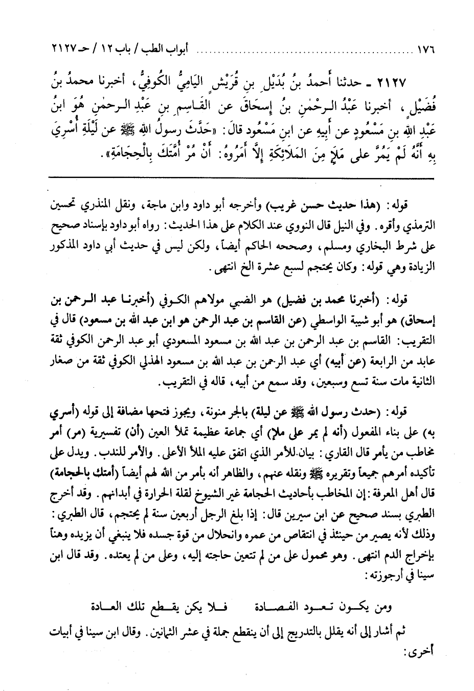 وَفِي النَّيْلِ قَالَ النَّوَوِيُّ عِنْدَ الْكَلَامِ عَلَى هَذَا الْحَدِيثِ رَوَاهُ أَبُو دَاوُدَ بِإِسْنَادٍ صَحِيحٍ عَلَى شَرْطِ الْبُخَارِيِّ وَمُسْلِمٍ وَصَحَّحَهُ الْحَاكِمُ أَيْضًا وَلَكِنْ لَيْسَ فِي حَدِيثِ أَبِي دَاوُدَ الْمَذْكُورِ الزِّيَادَةُ وَهِيَ قَوْلُهُ وَكَانَ يَحْتَجِمُ لِسَبْعَ عَشْرَةَ إِلَخِ انْتَهَى