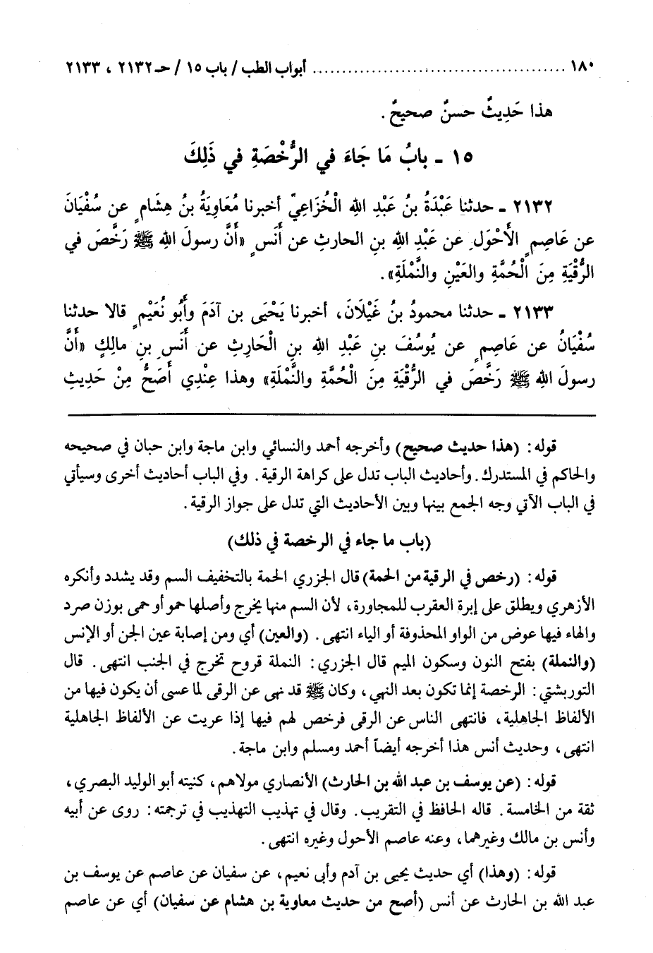 فِي ذَلِكَ قَوْلُهُ [2056] (رَخَّصَ فِي الرُّقْيَةِ مِنَ الْحُمَّةِ) قَالَ الْجَزَرِيُّ الْحُمَّةُ بِالتَّخْفِيفِ السُّمُّ وَقَدْ يُشَدَّدُ وَأَنْكَرَهُ الْأَزْهَرِيُّ وَيُطْلَقُ عَلَى إِبْرَةِ الْعَقْرَبِ لِلْمُجَاوَرَةِ لِأَنَّ السُّمَّ مِنْهَا يَخْرُجُ وَأَصْلُهَا حَمْوٌ أَوْ حُمَى بِوَزْنِ صُرَدٍ وَالْهَاءُ فِيهَا عِوَضٌ مِنَ الْوَاوِ الْمَحْذُوفَةِ أَوِ الْيَاءِ انْتَهَى