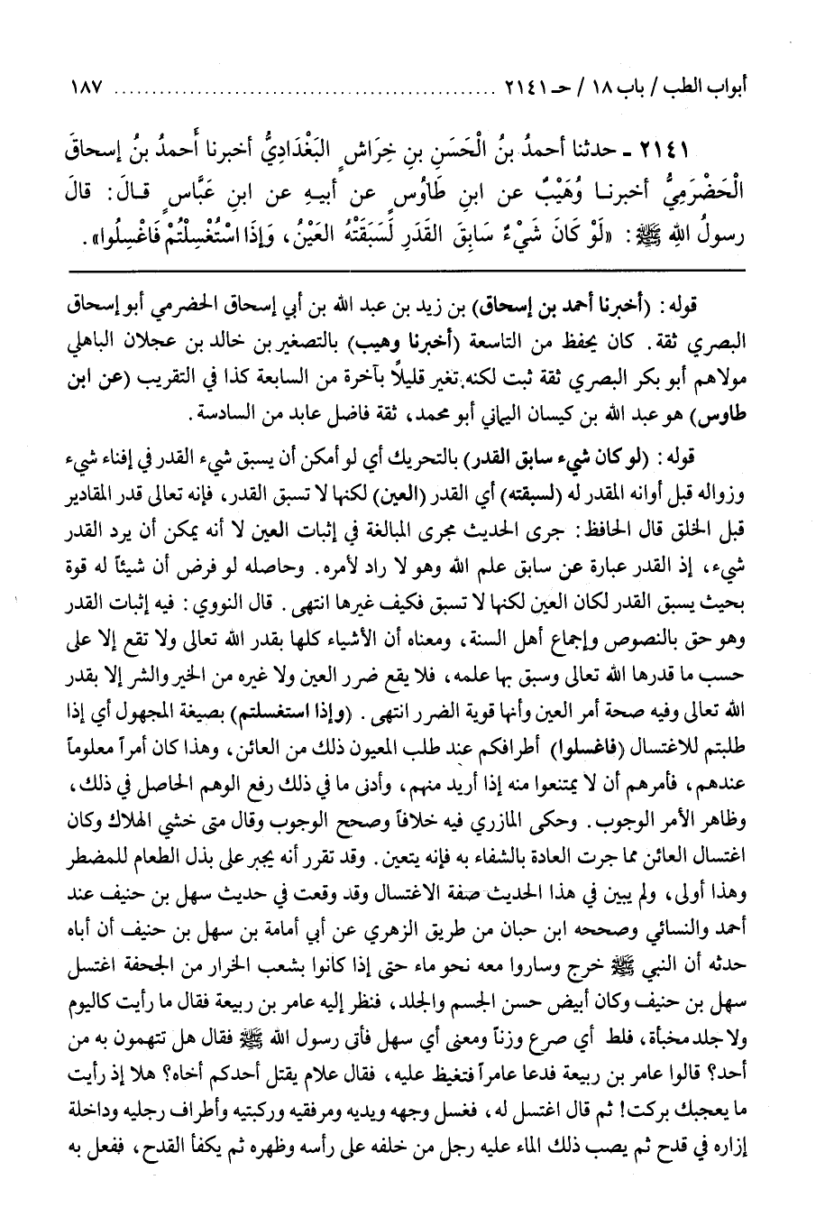 وَقَدْ تَقَرَّرَ أَنَّهُ يُجْبَرُ عَلَى بَذْلِ الطَّعَامِ لِلْمُضْطَرِّ وَهَذَا أَوْلَى وَلَمْ يُبَيِّنْ فِي هَذَا الْحَدِيثِ صِفَةَ الِاغْتِسَالِ وَقَدْ وَقَعَتْ فِي حَدِيثِ سَهْلِ بْنِ حنيف عند أحمد والنسائي وصححه بن حِبَّانَ مِنْ طَرِيقِ الزُّهْرِيِّ عَنْ أَبِي أُمَامَةَ بْنِ سَهْلِ بْنِ حُنَيْفٍ أَنَّ أَبَاهُ حَدَّثَهُ أَنَّ النَّبِيَّ صَلَّى اللَّهُ عَلَيْهِ وَسَلَّمَ خَرَجَ وَسَارُوا مَعَهُ نَحْوَ مَاءٍ حَتَّى إِذَا كَانُوا بشعب الخرار من الحجفة اغْتَسَلَ سَهْلُ بْنُ حُنَيْفٍ وَكَانَ أَبْيَضَ حَسَنَ الْجِسْمِ وَالْجِلْدِ فَنَظَرَ إِلَيْهِ عَامِرُ بْنُ رَبِيعَةَ فَقَالَ مَا رَأَيْتُ كَالْيَوْمِ وَلَا جِلْدَ مُخَبَّأَةٍ فليط أَيْ صُرِعَ وَزْنًا وَمَعْنًى أَيْ سَهْلٌ فَأَتَى رسول الله صلى الله عليه وسلم فقال هَلْ تَتَّهِمُونَ بِهِ مِنْ أَحَدٍ قَالُوا عَامِرَ بْنَ رَبِيعَةَ فَدَعَا عَامِرًا فَتَغَيَّظَ عَلَيْهِ فَقَالَ علام يقتل أحدكم أخاه هلا إذ رَأَيْتَ مَا يُعْجِبُكَ بَرَّكْتَ ثُمَّ قَالَ اغْتَسِلْ لَهُ فَغَسَلَ وَجْهَهُ وَيَدَيْهِ وَمِرْفَقَيْهِ وَرُكْبَتَيْهِ وَأَطْرَافَ رِجْلَيْهِ وَدَاخِلَةَ إِزَارِهِ فِي قَدَحٍ ثُمَّ يَصُبُّ ذَلِكَ الْمَاءَ عَلَيْهِ رَجُلٌ مِنْ خَلْفِهِ عَلَى رَأْسِهِ وَظَهْرِهِ ثُمَّ يُكْفَأُ الْقَدَحُ فَفَعَلَ بِهِ