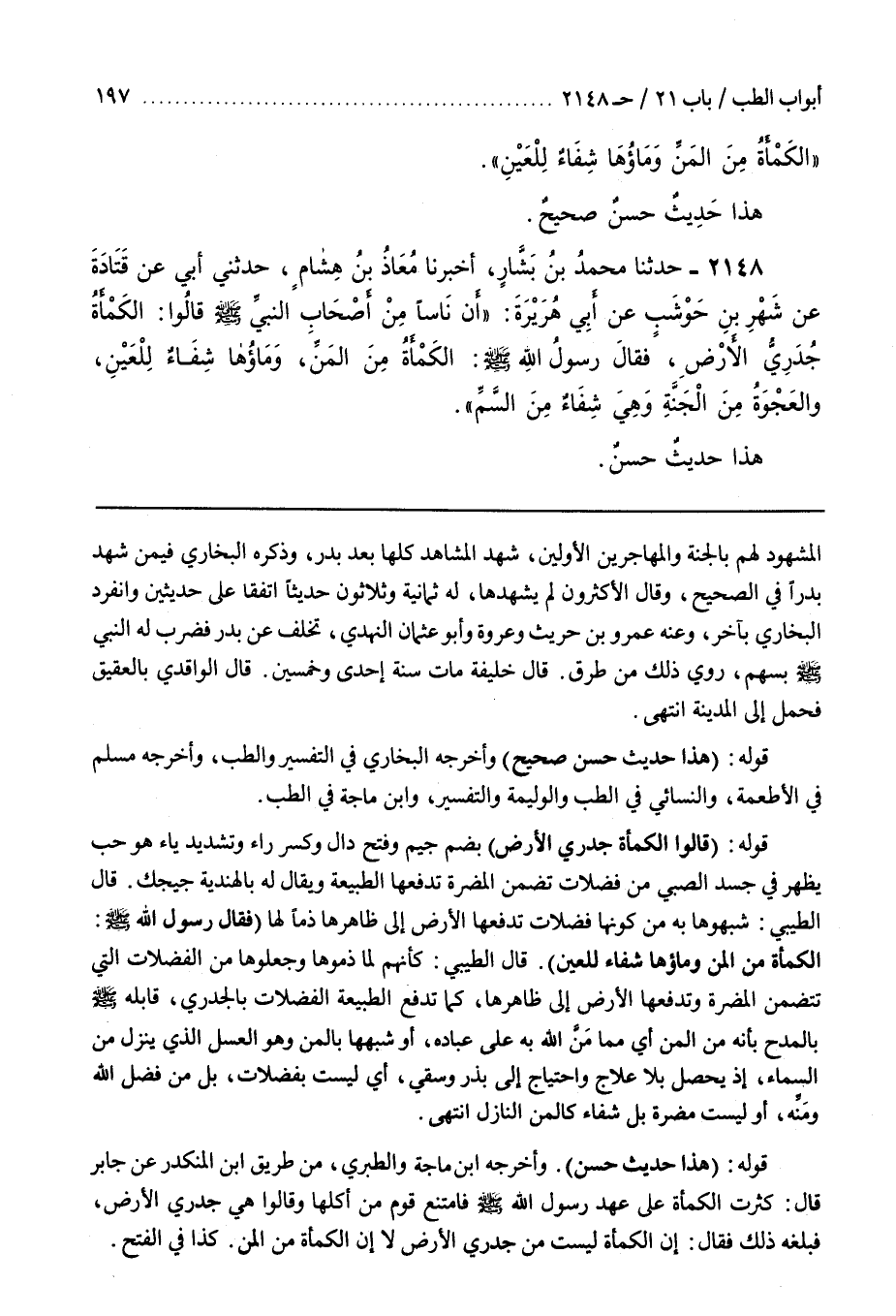 وأخرجه بن ماجة والطبري من طريق بن الْمُنْكَدِرِ عَنْ جَابِرٍ قَالَ كَثُرَتِ الْكَمْأَةُ عَلَى عَهْدِ رَسُولِ اللَّهِ صَلَّى اللَّهُ عَلَيْهِ وَسَلَّمَ فَامْتَنَعَ قَوْمٌ مِنْ أَكْلِهَا وَقَالُوا هِيَ جُدَرِيُّ الْأَرْضِ فَبَلَغَهُ ذَلِكَ فَقَالَ إِنَّ الْكَمْأَةَ لَيْسَتْ مِنْ جُدَرِيِّ الْأَرْضِ لَا إِنَّ الْكَمْأَةَ مِنَ الْمَنِّ