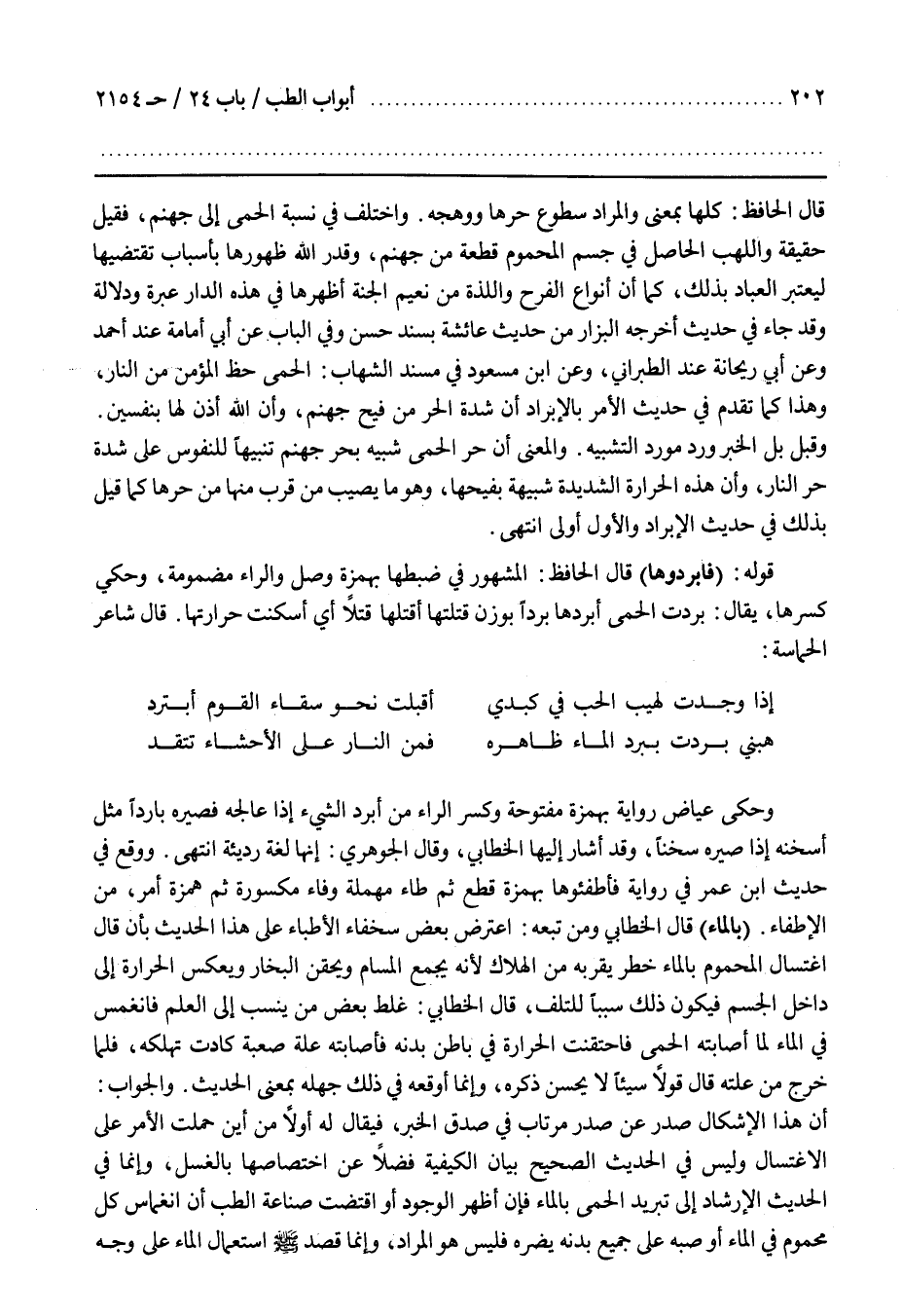 قَالَ شَاعِرُ الْحَمَاسَةِ إِذَا وَجَدْتُ لَهِيبَ الْحُبِّ فِي كَبِدِي أَقْبَلْتُ نَحْوَ سِقَاءِ الْقَوْمِ أَبْتَرِدُ هَبْنِي بَرَدْتُ بِبَرْدِ الْمَاءِ ظاهره فمن لنار عَلَى الْأَحْشَاءِ تَتَّقِدُ وَحَكَى عِيَاضٌ رِوَايَةً بِهَمْزَةِ قَطْعٍ مَفْتُوحَةٍ وَكَسْرِ الرَّاءِ مِنْ أَبْرَدَ الشَّيْءَ إِذَا عَالَجَهُ فَصَيَّرَهُ بَارِدًا مِثْلَ أَسْخَنَهُ إِذَا صَيَّرَهُ سُخْنًا وَقَدْ أَشَارَ إِلَيْهَا الْخَطَّابِيُّ وَقَالَ الْجَوْهَرِيُّ إِنَّهَا لُغَةٌ رَدِيئَةٌ انْتَهَى