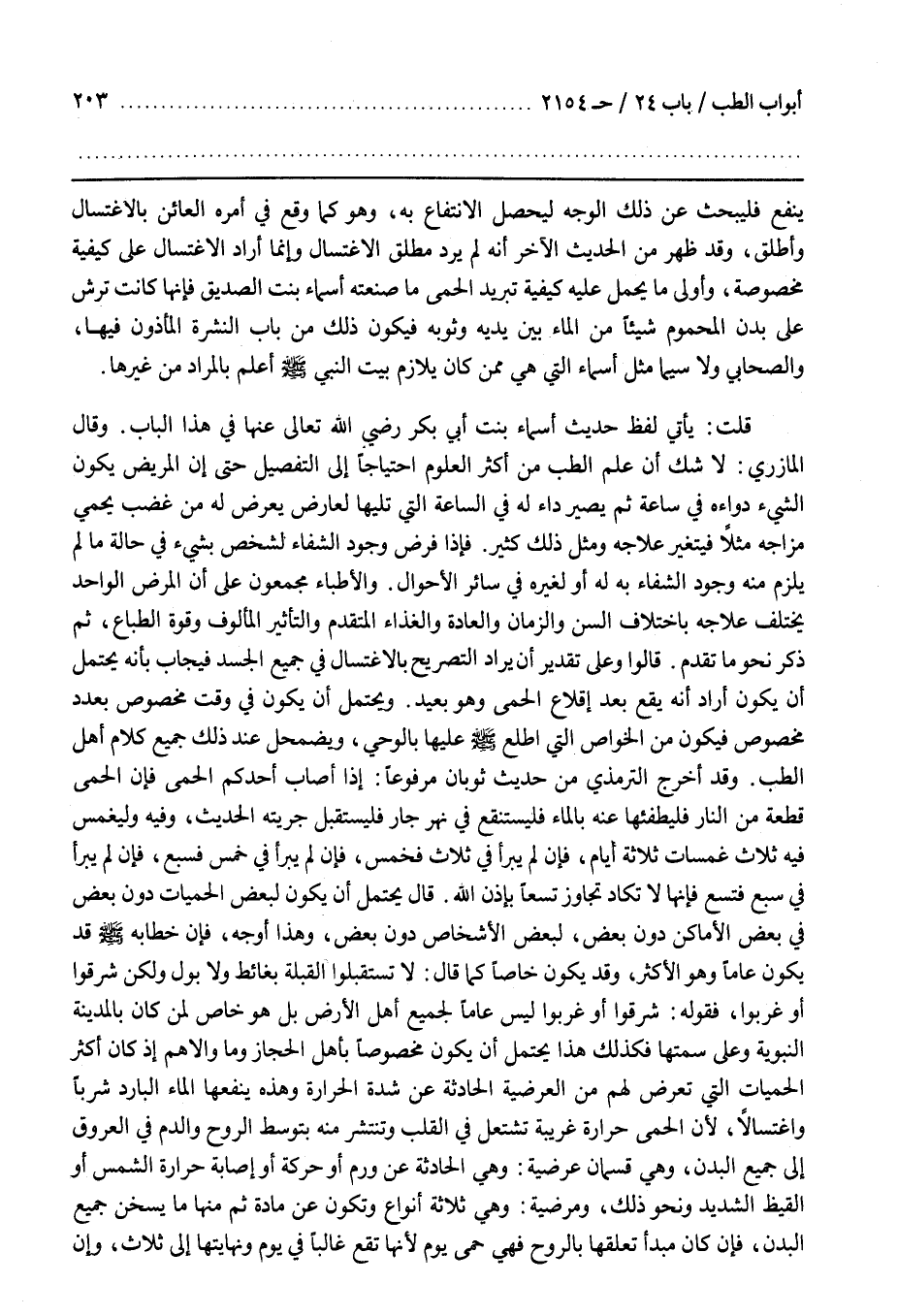 قَالَ وَيُحْتَمَلُ أَنْ يَكُونَ لِبَعْضِ الْحُمَّيَاتِ دُونَ بَعْضٍ فِي بَعْضِ الْأَمَاكِنِ دُونَ بَعْضٍ لِبَعْضِ الْأَشْخَاصِ دُونَ بَعْضٍ وَهَذَا أَوْجَهُ فَإِنَّ خِطَابَهُ صَلَّى اللَّهُ عَلَيْهِ وَسَلَّمَ قَدْ يَكُونُ عَامًّا وَهُوَ الْأَكْثَرُ وَقَدْ يَكُونُ خَاصًّا كَمَا قَالَ لَا تَسْتَقْبِلُوا الْقِبْلَةَ بِغَائِطٍ وَلَا بَوْلٍ وَلَكِنْ شَرِّقُوا أَوْ غَرِّبُوا فَقَوْلُهُ شَرِّقُوا أَوْ غَرِّبُوا لَيْسَ عَامًّا لِجَمِيعِ أَهْلِ الْأَرْضِ بَلْ هُوَ خَاصٌّ لِمَنْ كَانَ بِالْمَدِينَةِ النَّبَوِيَّةِ وَعَلَى سَمْتِهَا فَكَذَلِكَ هَذَا يُحْتَمَلُ أَنْ يَكُونَ مَخْصُوصًا بِأَهْلِ الْحِجَازِ وَمَا وَالَاهُمْ إِذْ كَانَ أَكْثَرُ الْحُمَّيَاتِ الَّتِي تَعْرِضُ لَهُمْ مِنَ الْعَرَضِيَّةِ الْحَادِثَةِ عَنْ شِدَّةِ الْحَرَارَةِ وَهَذِهِ يَنْفَعُهَا الْمَاءُ الْبَارِدُ شُرْبًا وَاغْتِسَالًا لِأَنَّ الْحُمَّى حَرَارَةٌ غَرِيبَةٌ تَشْتَعِلُ فِي الْقَلْبِ وَتَنْتَشِرُ مِنْهُ بِتَوَسُّطِ الرُّوحِ وَالدَّمِ فِي الْعُرُوقِ إِلَى جَمِيعِ الْبَدَنِ وَهِيَ قِسْمَانِ عَرَضِيَّةٌ وَهِيَ الْحَادِثَةُ عَنْ وَرَمٍ أَوْ حَرَكَةٍ أَوْ إِصَابَةِ حَرَارَةِ الشَّمْسِ أَوِ الْقَيْظِ الشَّدِيدِ وَنَحْوِ ذَلِكَ وَمَرَضِيَّةٌ وَهِيَ ثَلَاثَةُ أَنْوَاعٍ وَتَكُونُ عَنْ مَادَّةٍ ثُمَّ مِنْهَا مَا يُسْخِنُ جَمِيعَ الْبَدَنِ فَإِنْ كَانَ مَبْدَأُ تَعَلُّقِهَا بِالرُّوحِ فَهِيَ حُمَّى يَوْمٍ لِأَنَّهَا تَقَعُ غَالِبًا فِي يَوْمٍ وَنِهَايَتُهَا إِلَى ثَلَاثٍ وَإِنْ